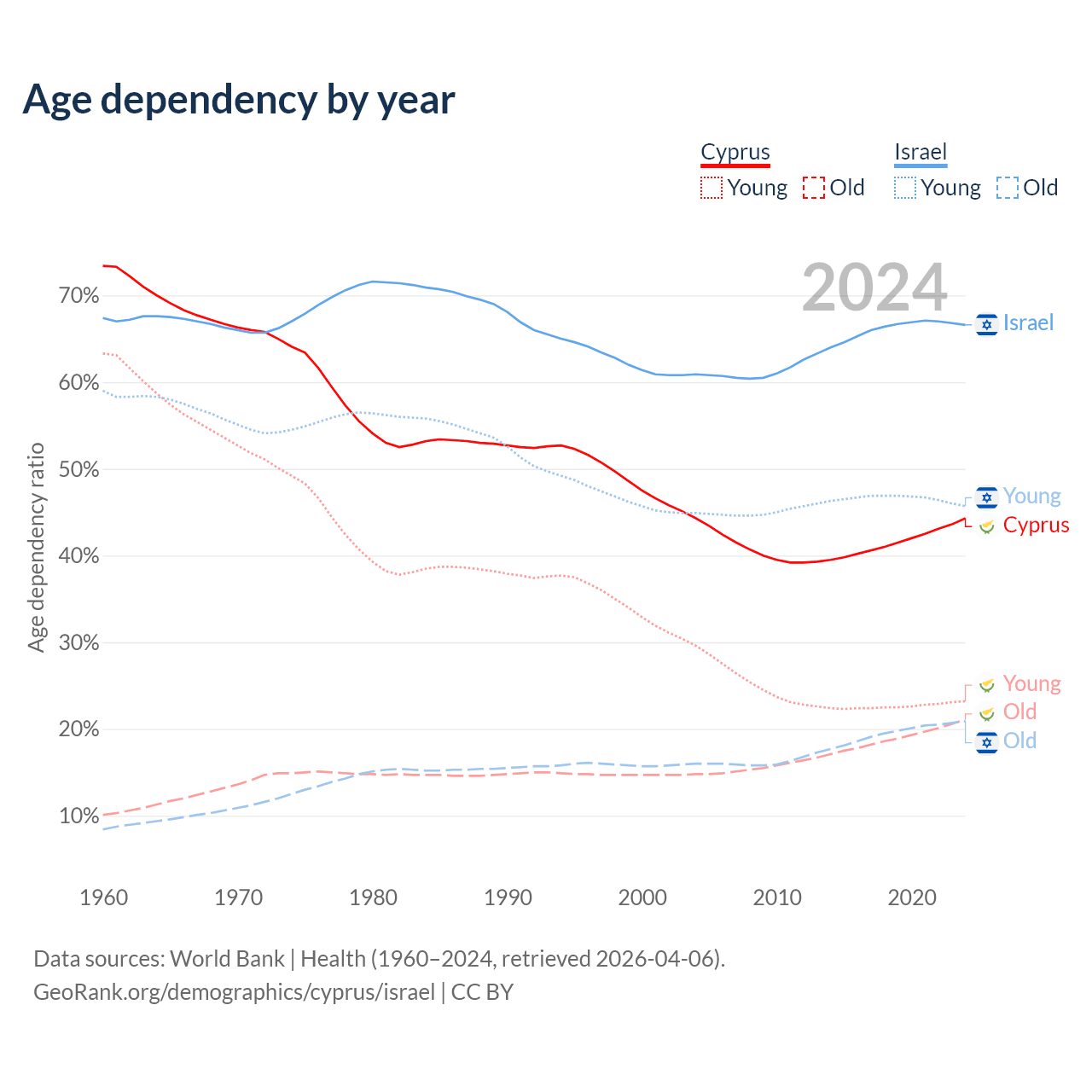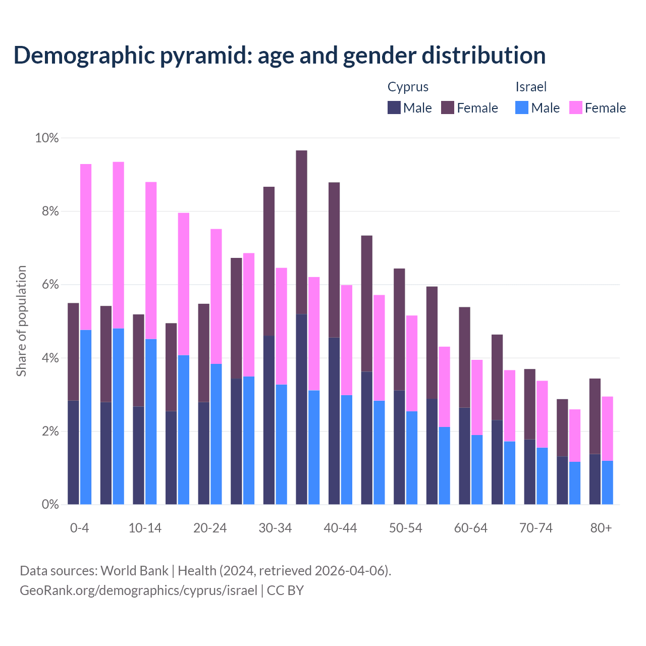 - Cyprus is ranked 52/196 by median age (oldest to youngest) vs 103/196 for Israel.