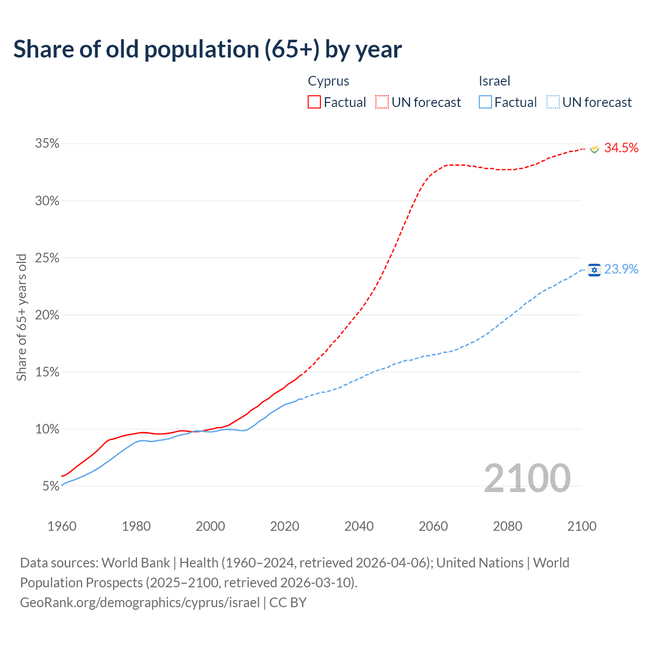 The share of older people aged 65 and over is 14.6% in Cyprus and 12.6% in Israel. Life expectancy in Cyprus compared to Israel .