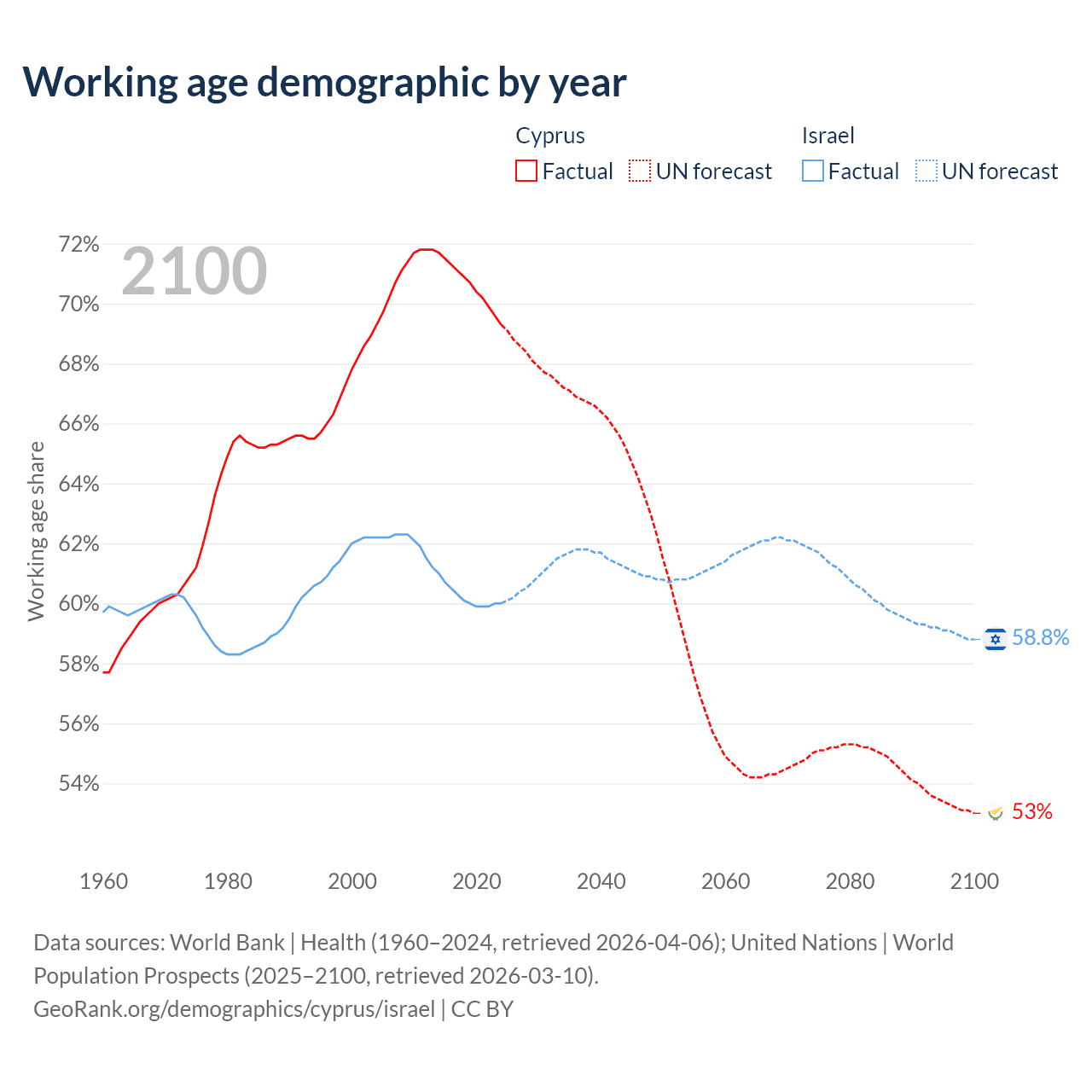 - Cyprus has 961K working age adults (aged 15-64) vs 6.18M in Israel.