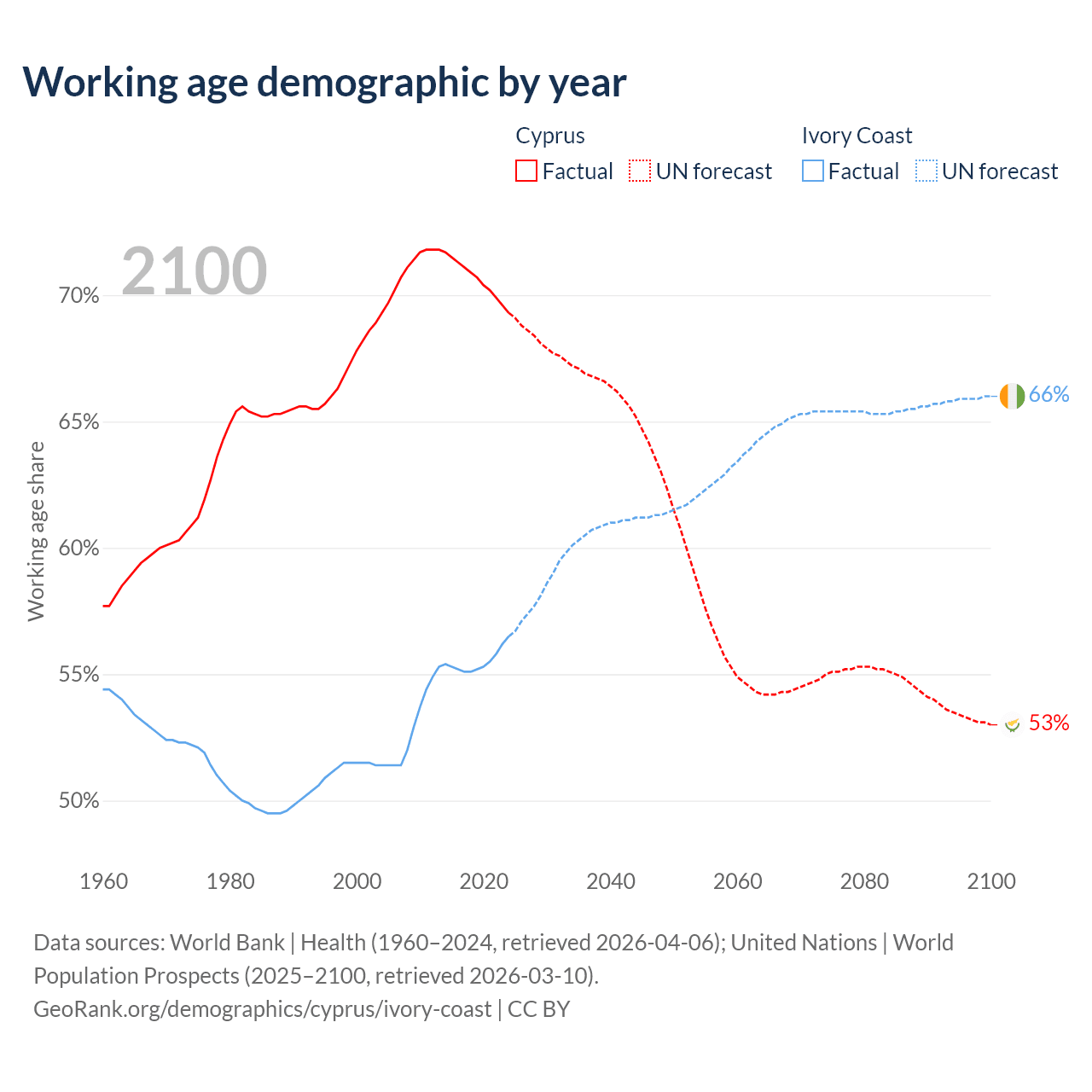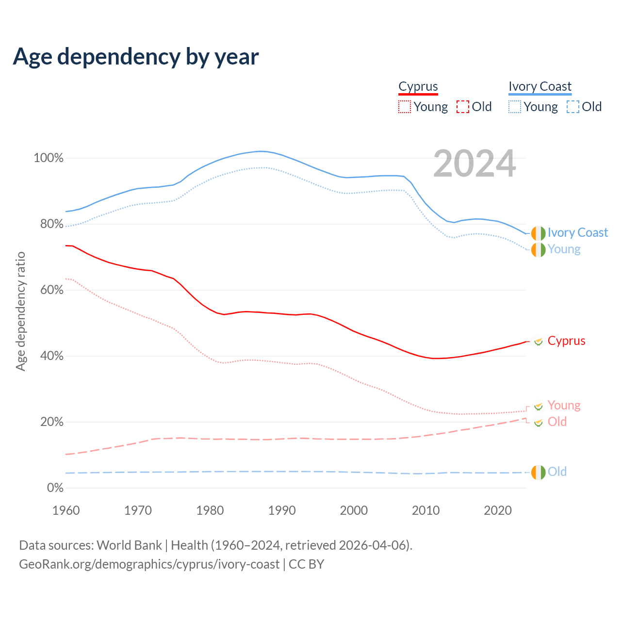 - Cyprus is ranked 52/196 by median age (oldest to youngest) vs 175/196 for Ivory Coast.