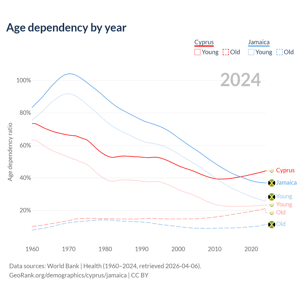 The share of older people aged 65 and over is 14.6% in Cyprus and 8.21% in Jamaica. Life expectancy in Cyprus compared to Jamaica .