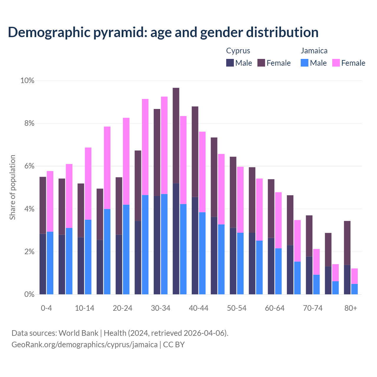 - Cyprus is ranked 52/196 by median age (oldest to youngest) vs 87/196 for Jamaica.