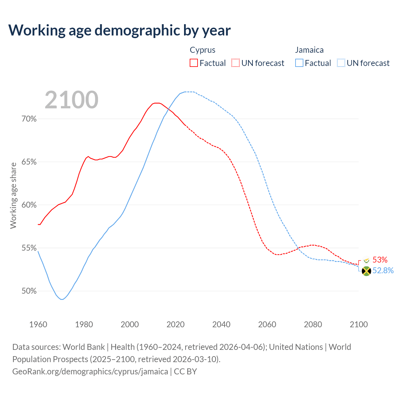 - Cyprus has 961K working age adults (aged 15-64) vs 2.07M in Jamaica.