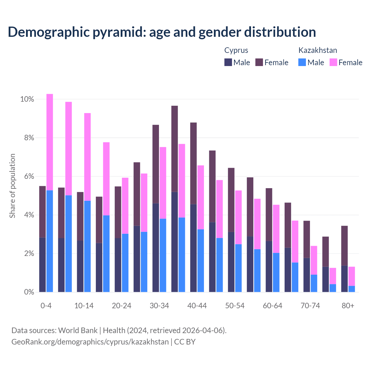 - Cyprus is ranked 52/196 by median age (oldest to youngest) vs 99/196 for Kazakhstan.
