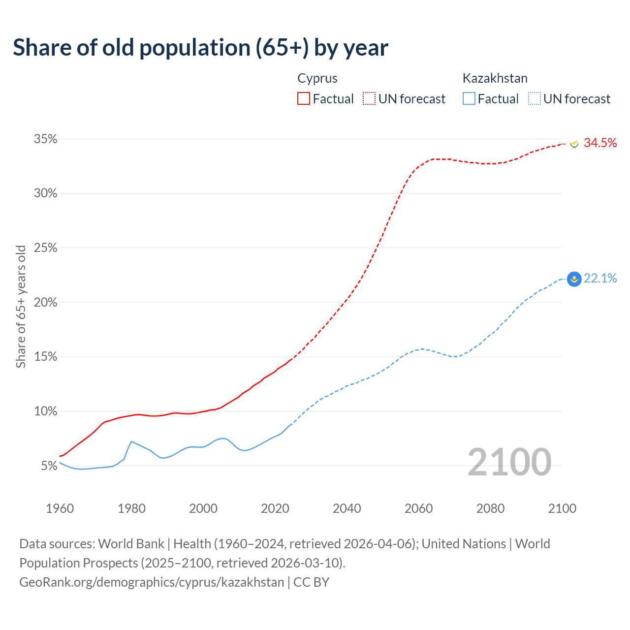 The share of older people aged 65 and over is 14.6% in Cyprus and 8.65% in Kazakhstan. Life expectancy in Cyprus compared to Kazakhstan .