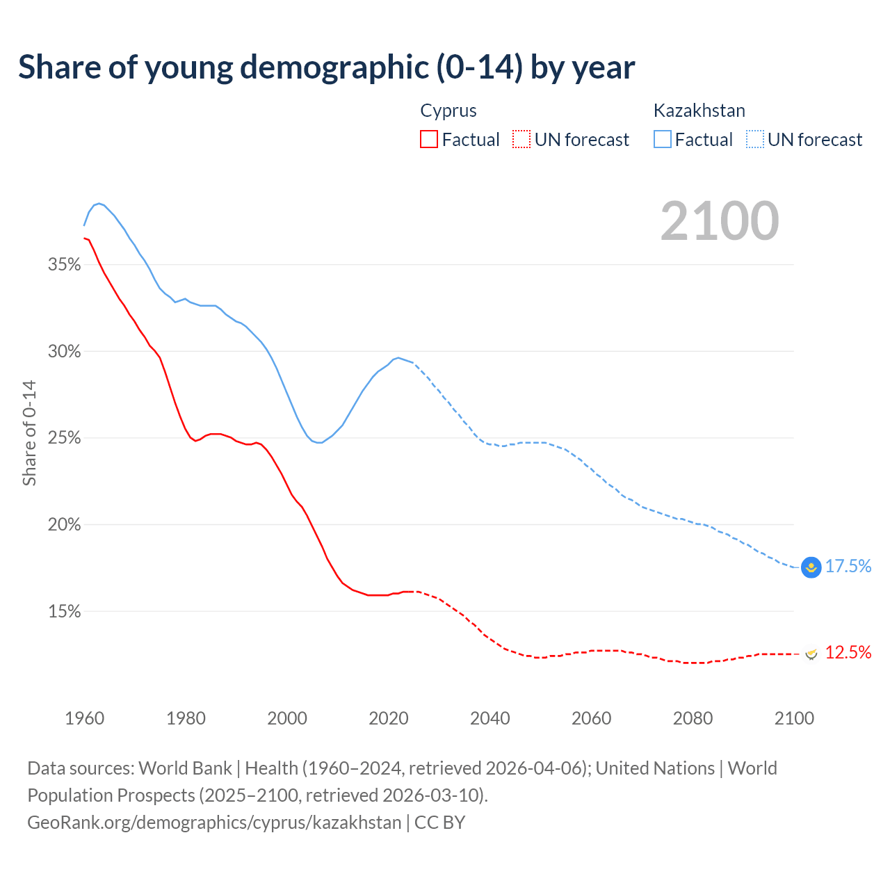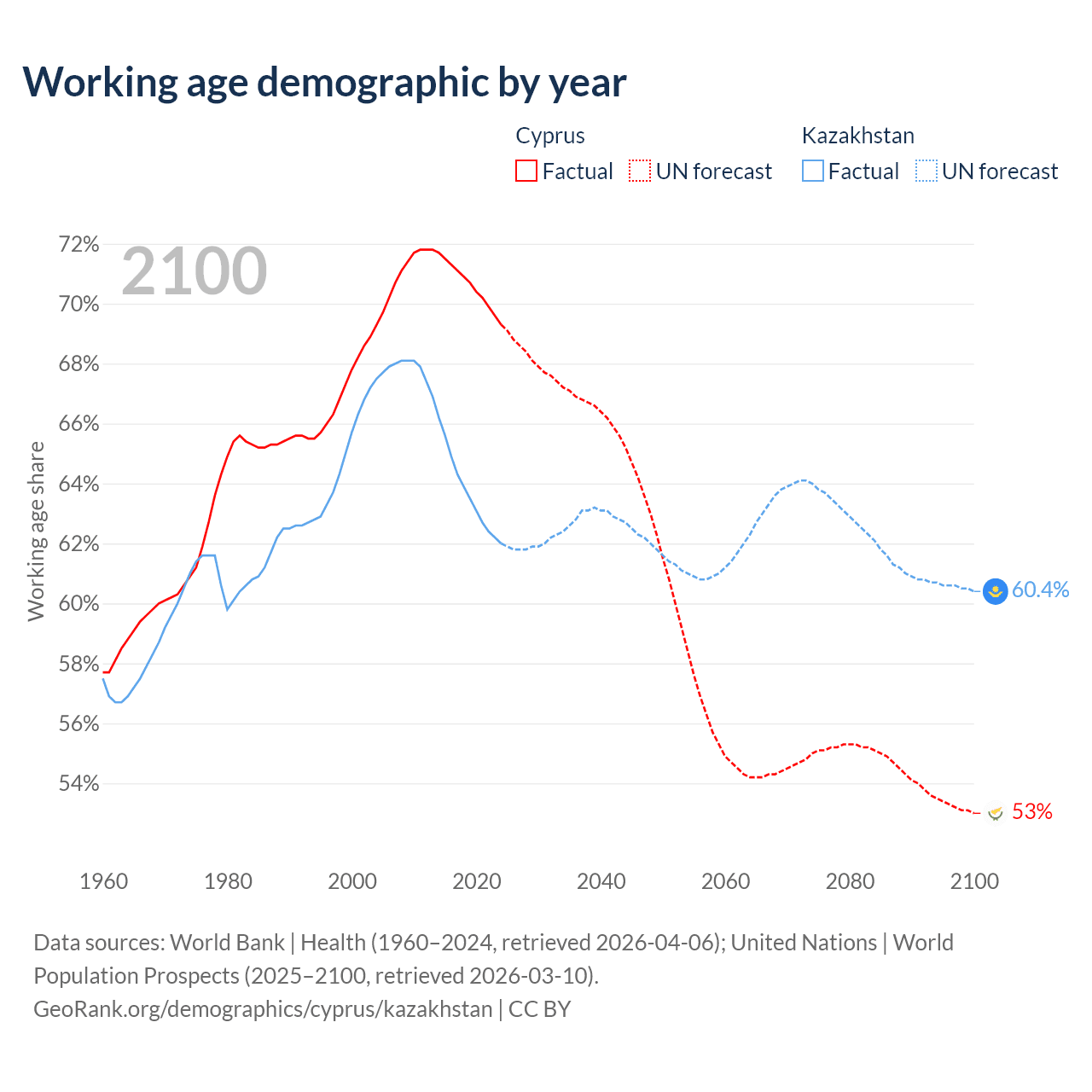 Median age Cyprus vs Kazakhstan, 1960-2100