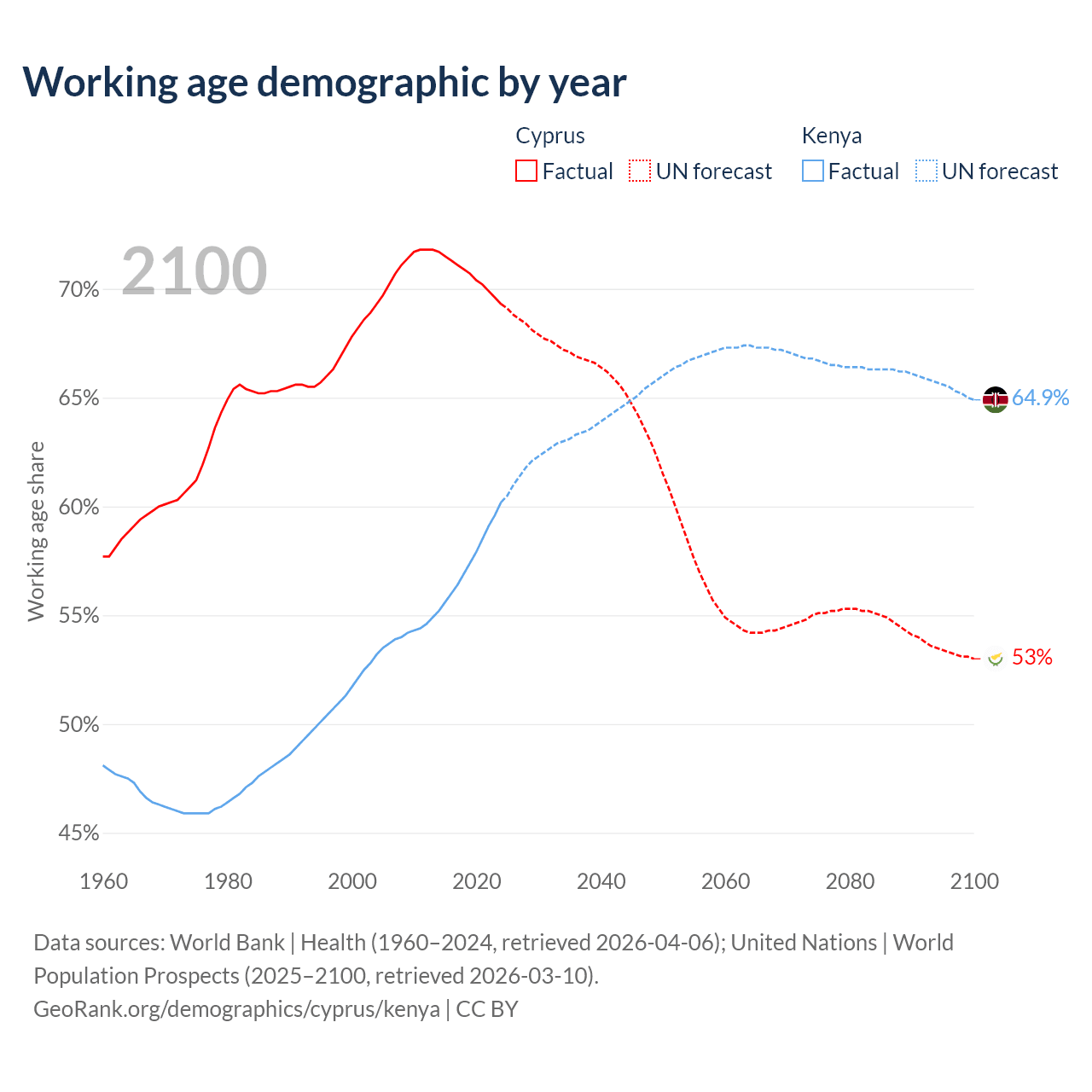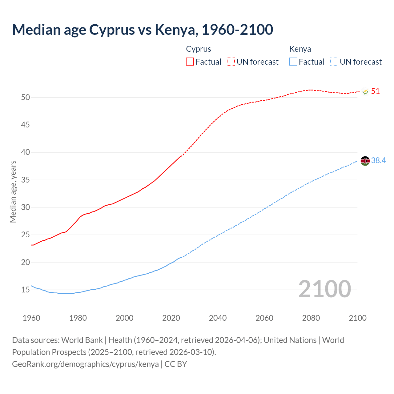 Median age Cyprus vs Kenya, 1960-2100