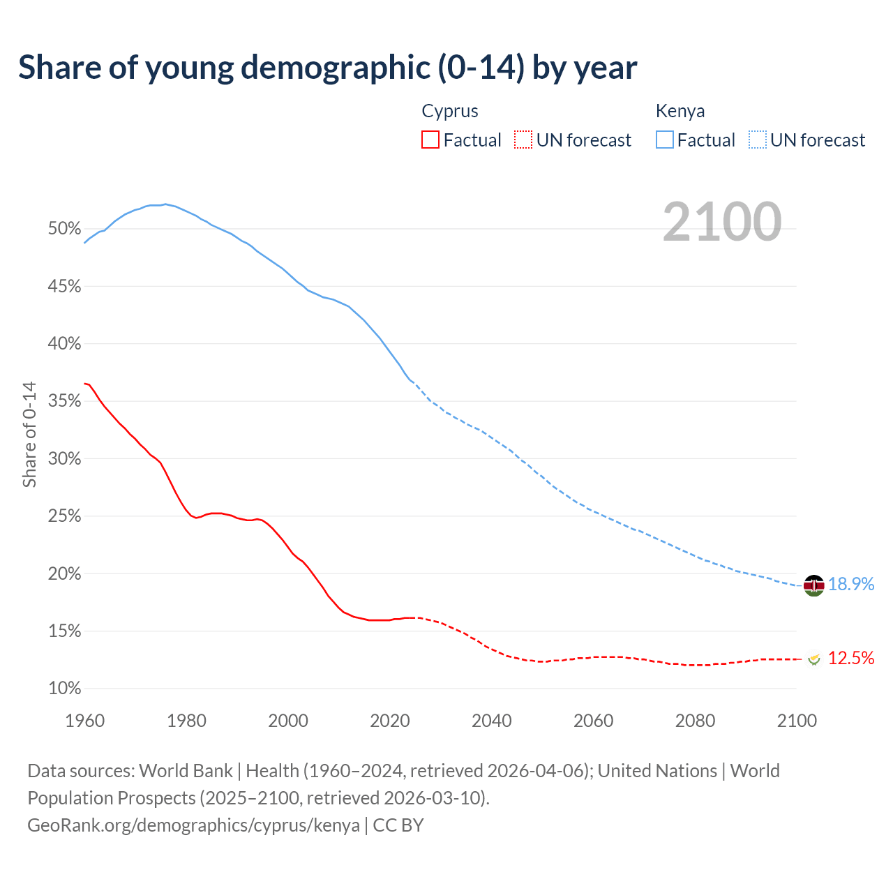 - The share of young demographic (0-15 years old) in Cyprus is 16.1% vs 36.8% in Kenya.