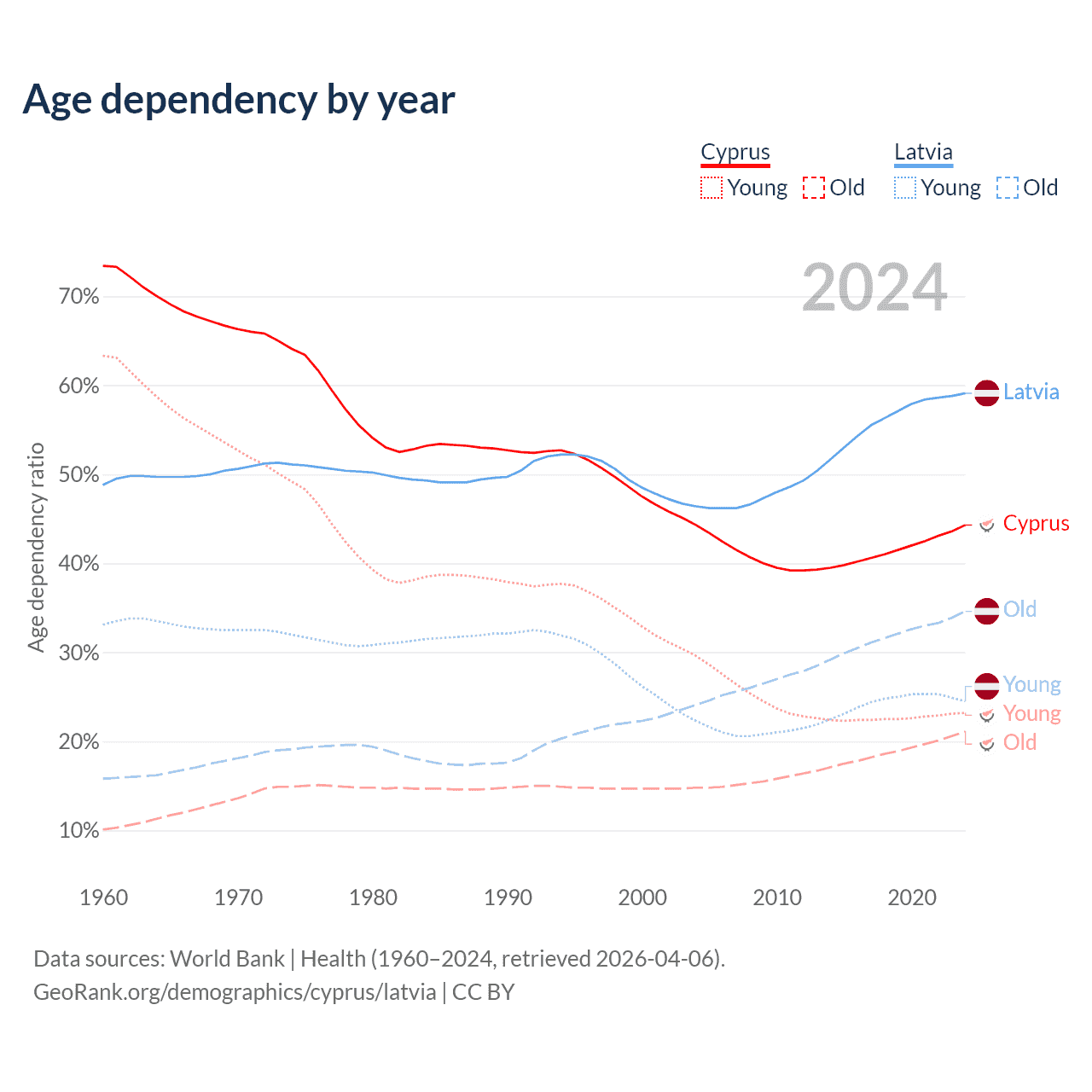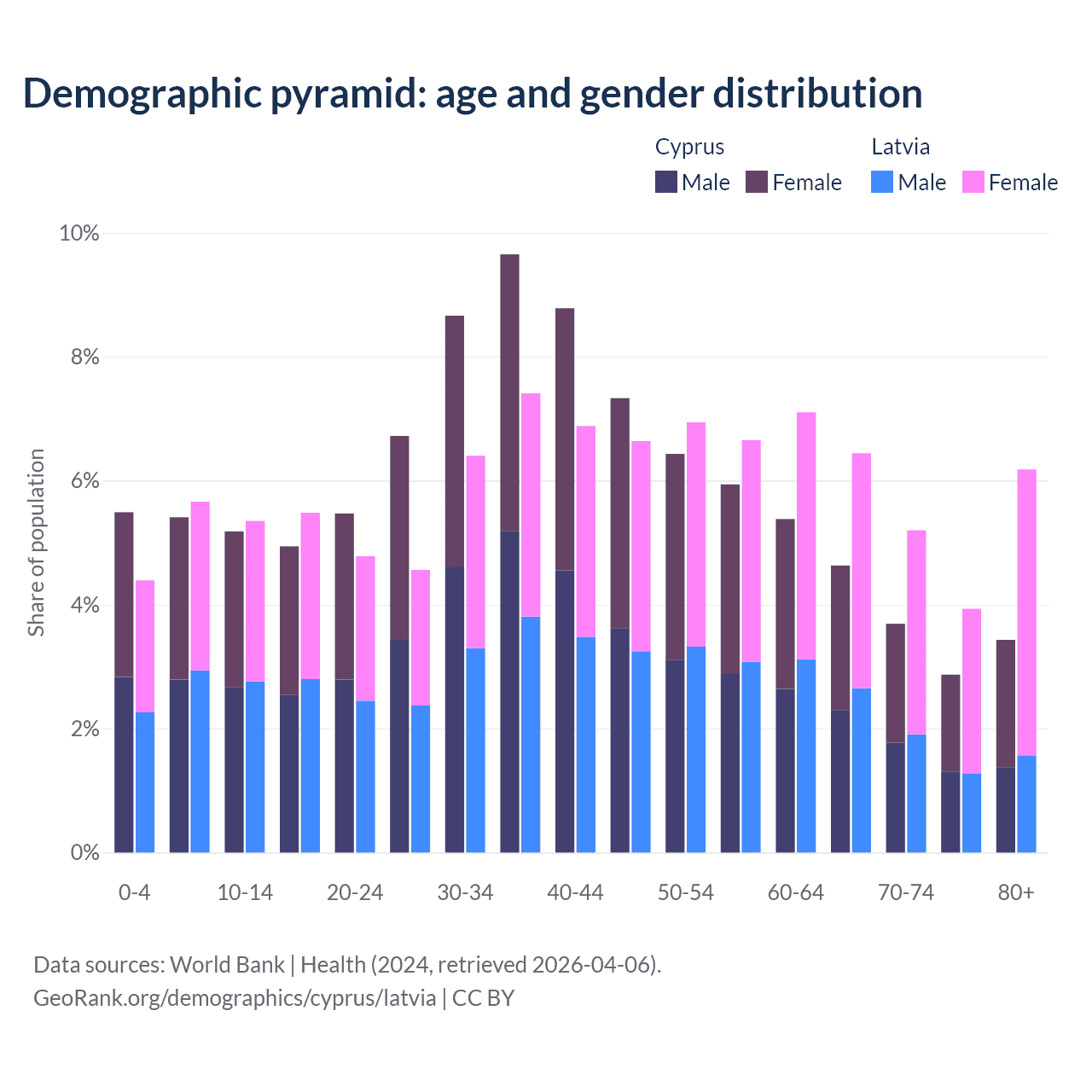 - Cyprus is ranked 52/196 by median age (oldest to youngest) vs 20/196 for Latvia.