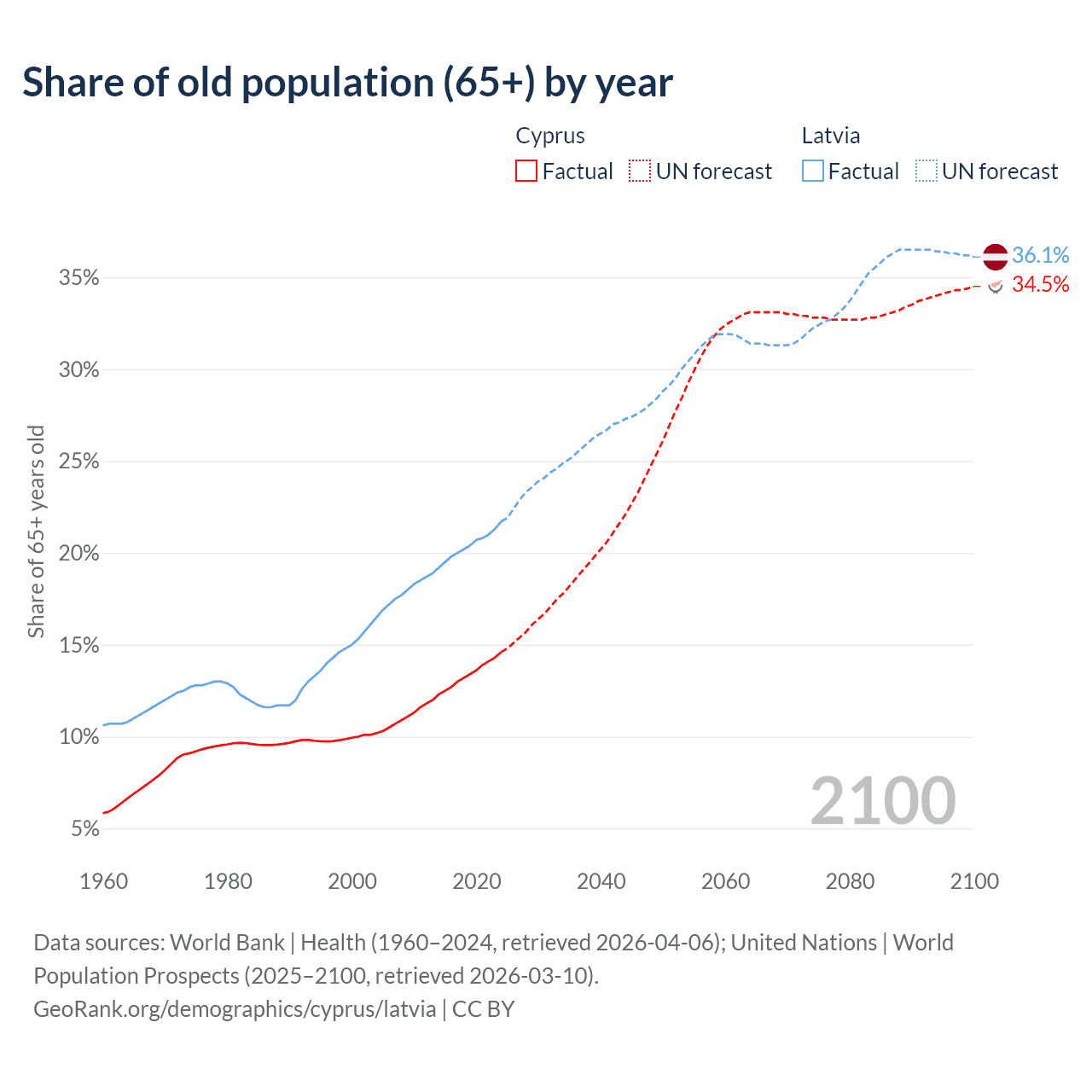 The share of older people aged 65 and over is 14.6% in Cyprus and 21.7% in Latvia. Life expectancy in Cyprus compared to Latvia .