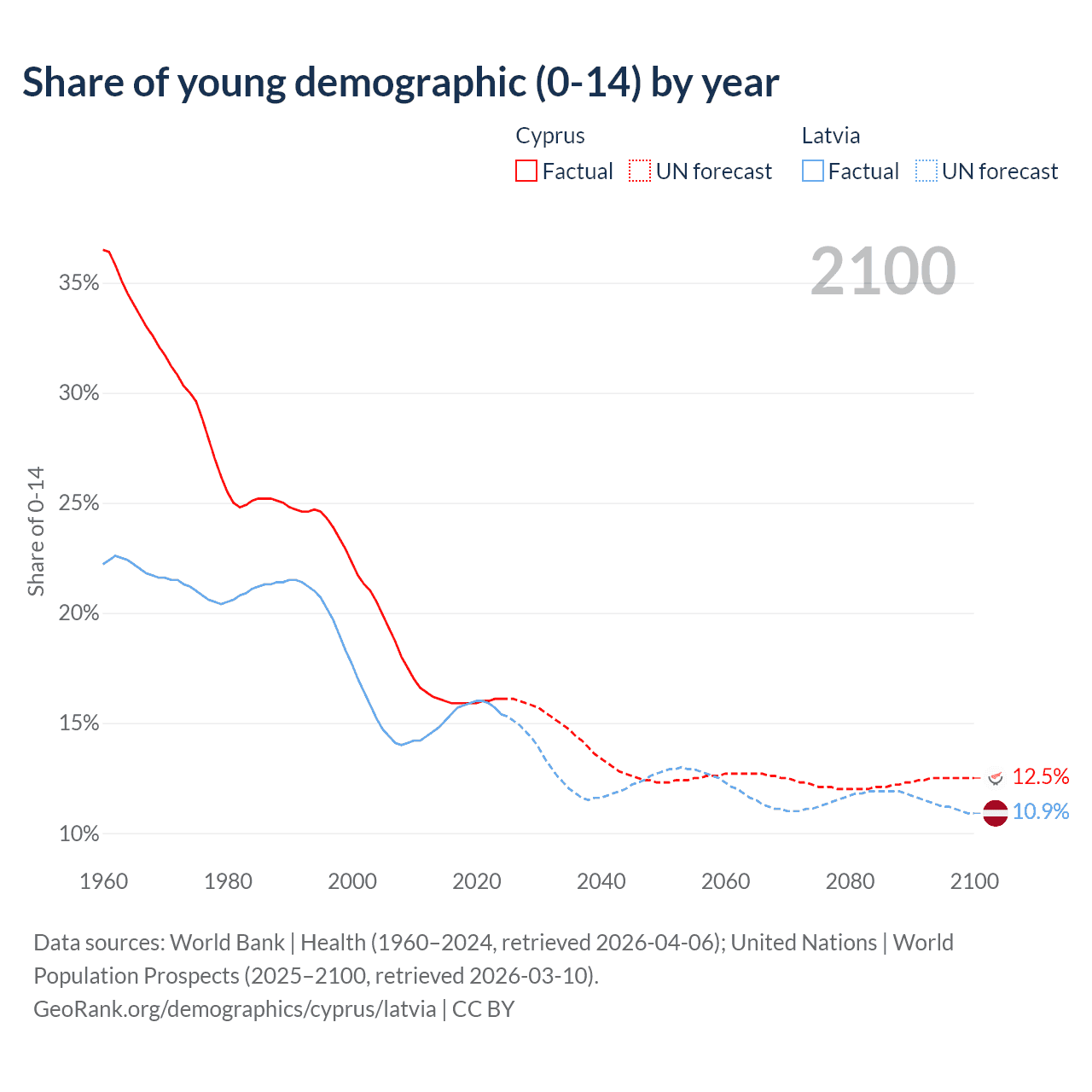 - The share of young demographic (0-15 years old) in Cyprus is 16.1% vs 15.4% in Latvia.