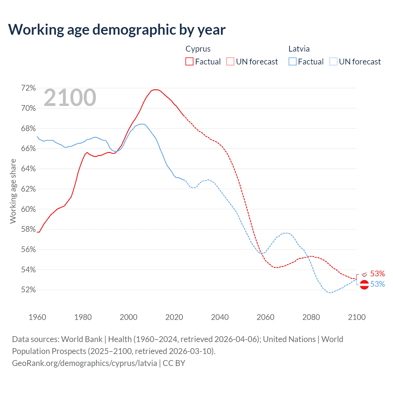 - Cyprus has 961K working age adults (aged 15-64) vs 1.15M in Latvia.