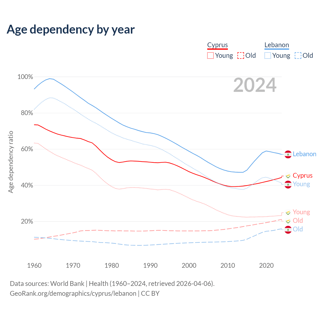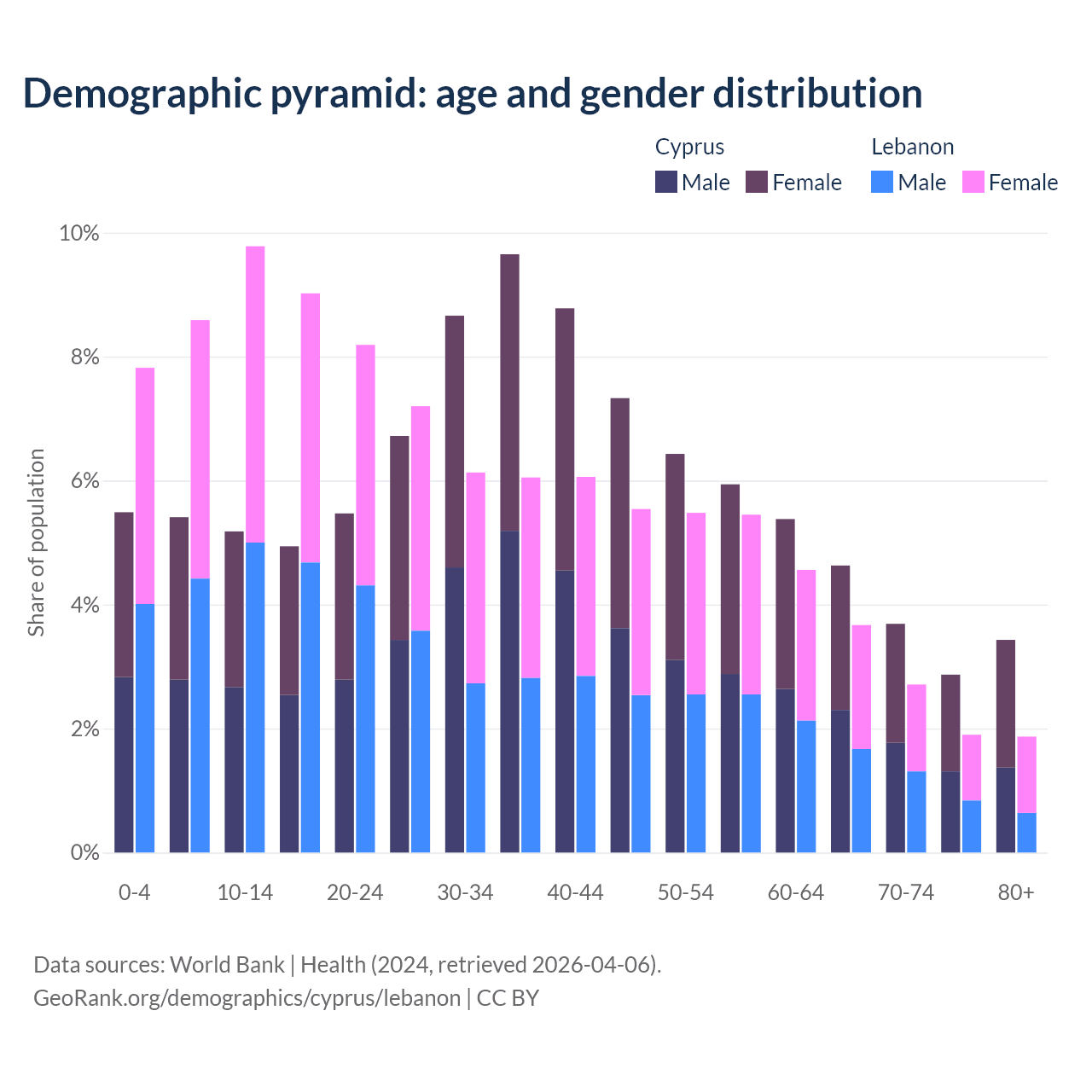 - Cyprus is ranked 52/196 by median age (oldest to youngest) vs 106/196 for Lebanon.