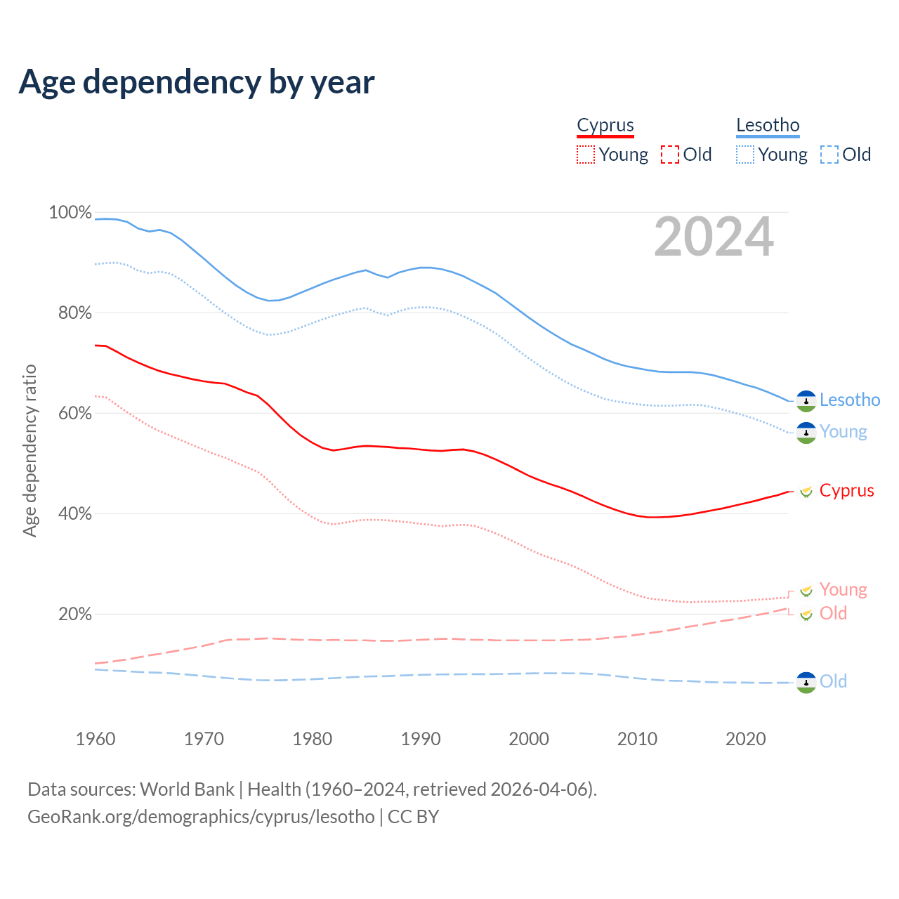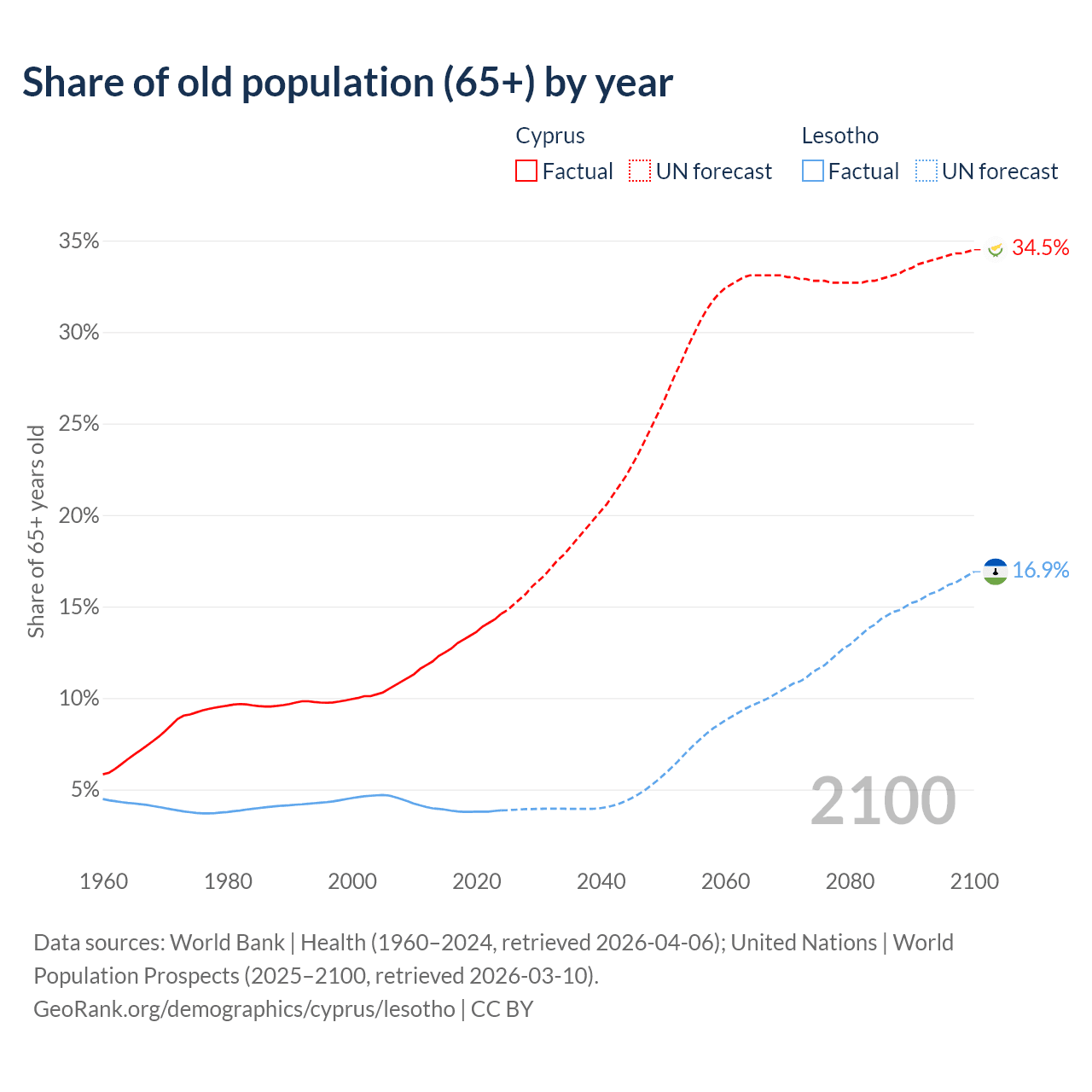 The share of older people aged 65 and over is 14.6% in Cyprus and 3.86% in Lesotho. Life expectancy in Cyprus compared to Lesotho .