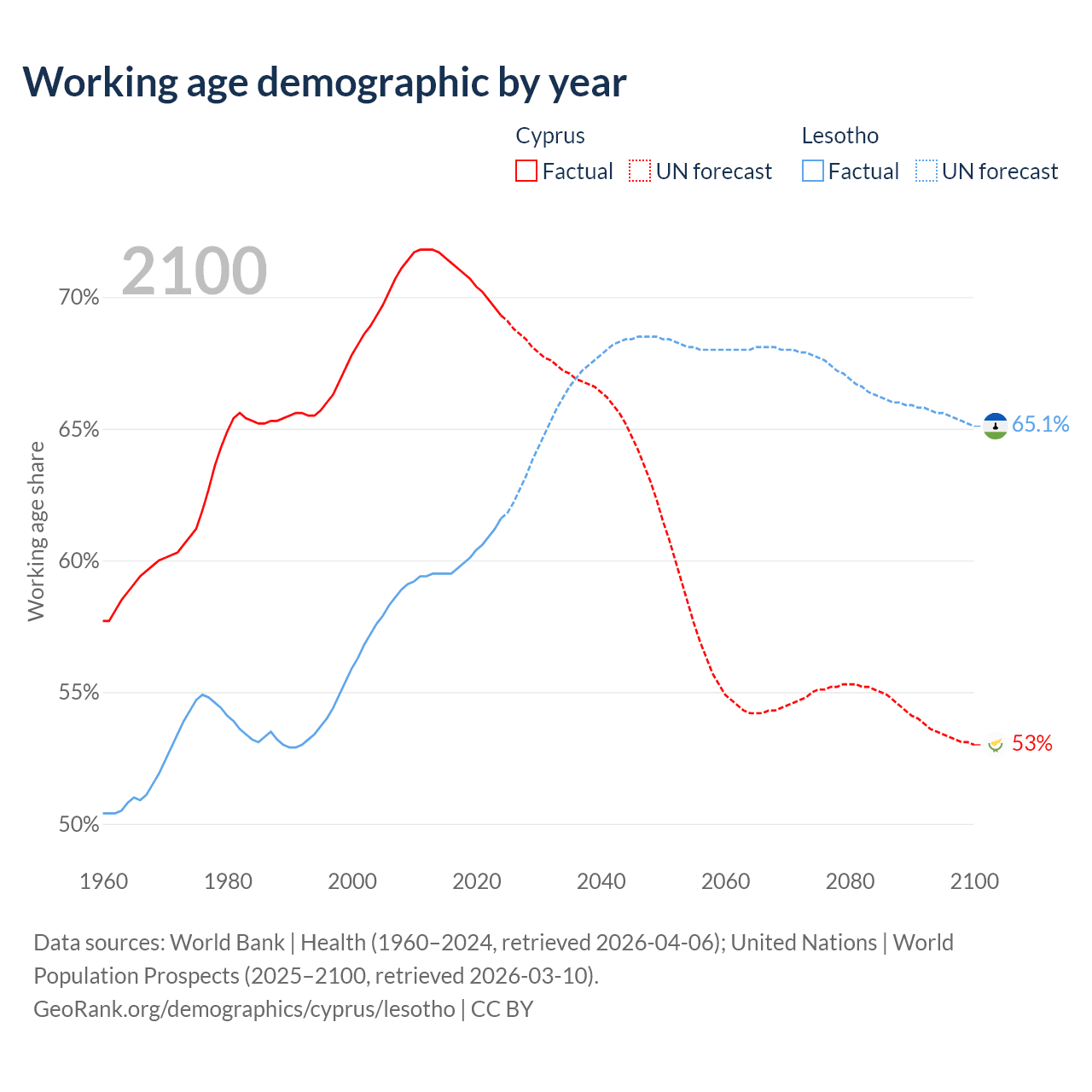 Median age Cyprus vs Lesotho, 1960-2100