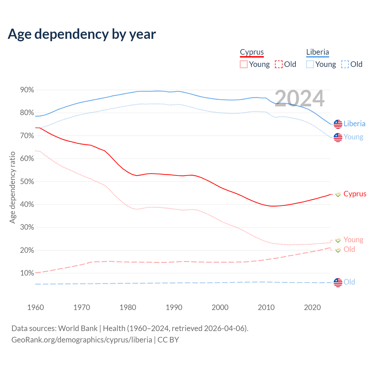 The share of older people aged 65 and over is 14.6% in Cyprus and 3.3% in Liberia. Life expectancy in Cyprus compared to Liberia .