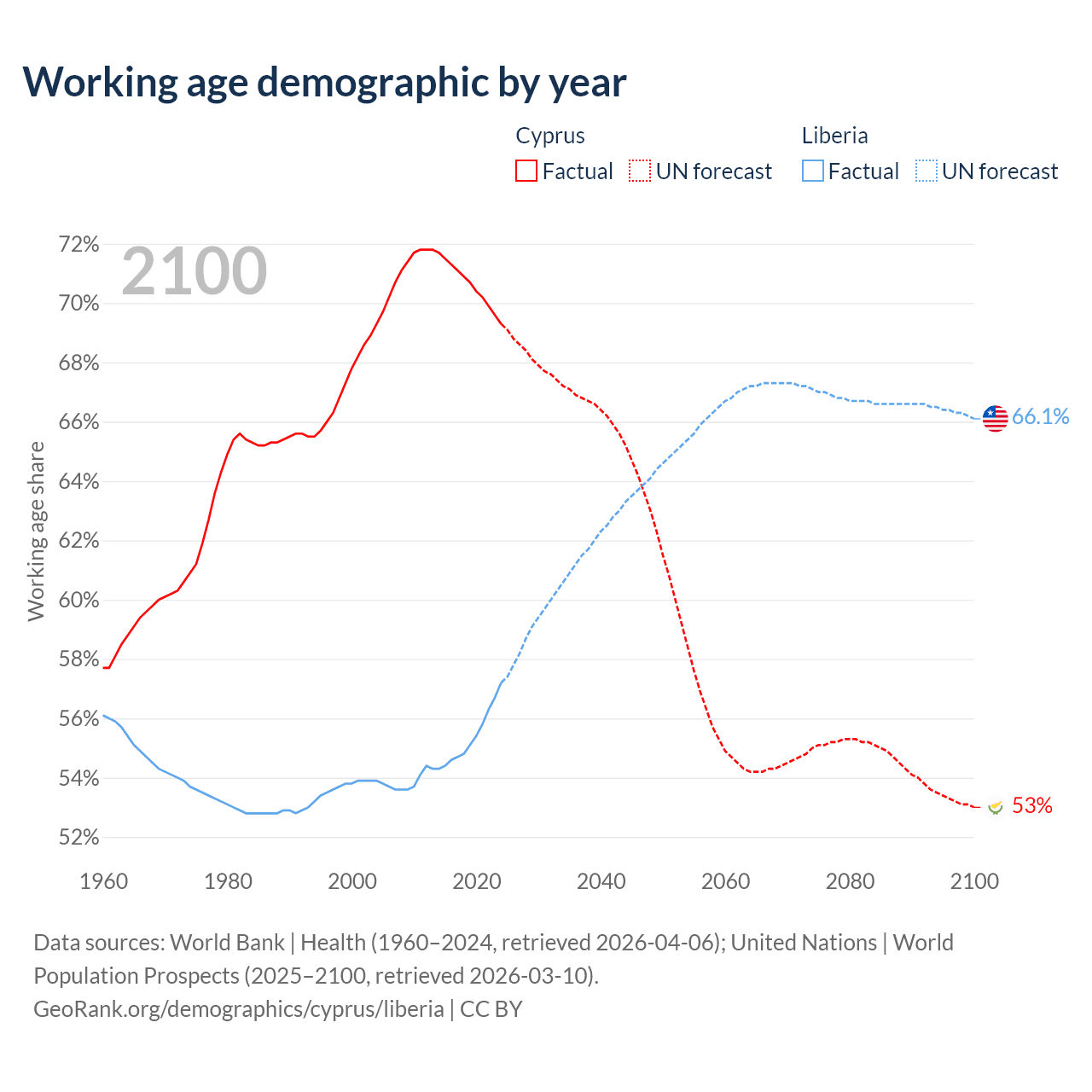 - Cyprus has 961K working age adults (aged 15-64) vs 3.37M in Liberia.