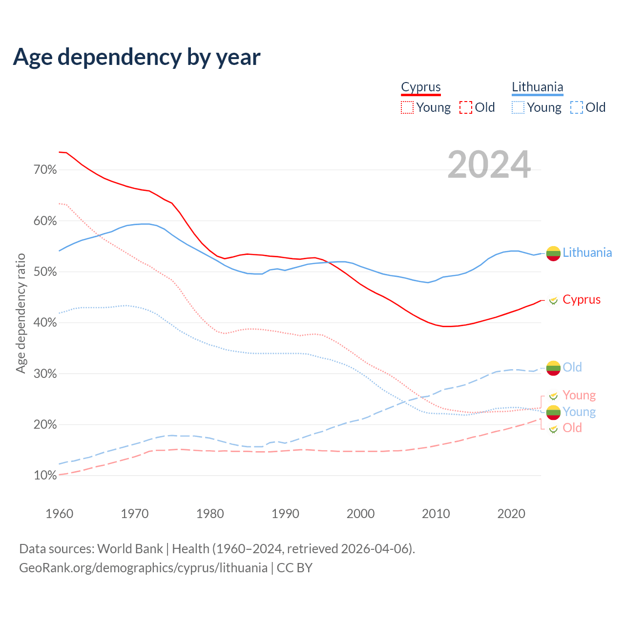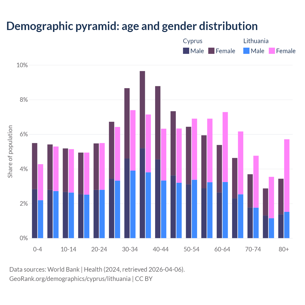 - Cyprus is ranked 52/196 by median age (oldest to youngest) vs 28/196 for Lithuania.