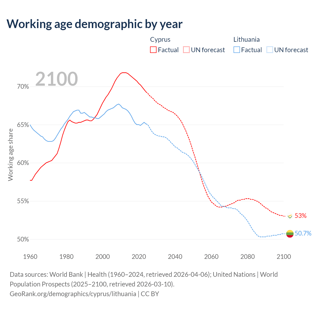 - Cyprus has 961K working age adults (aged 15-64) vs 1.84M in Lithuania.