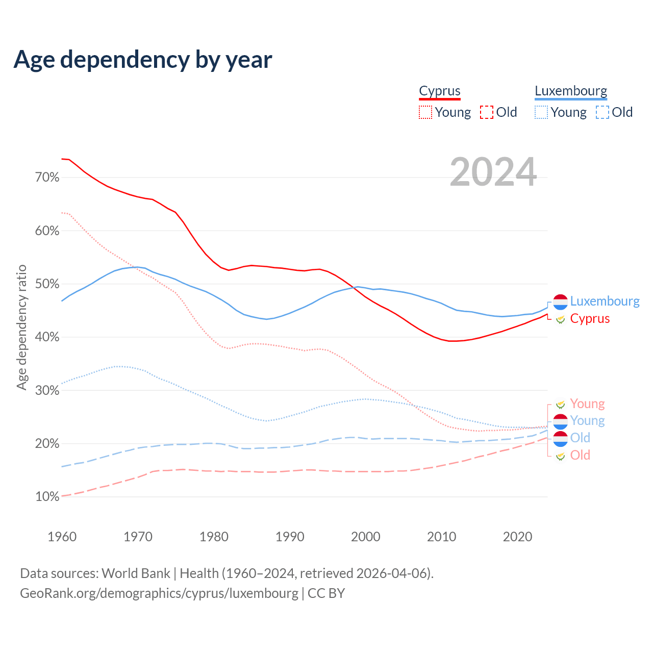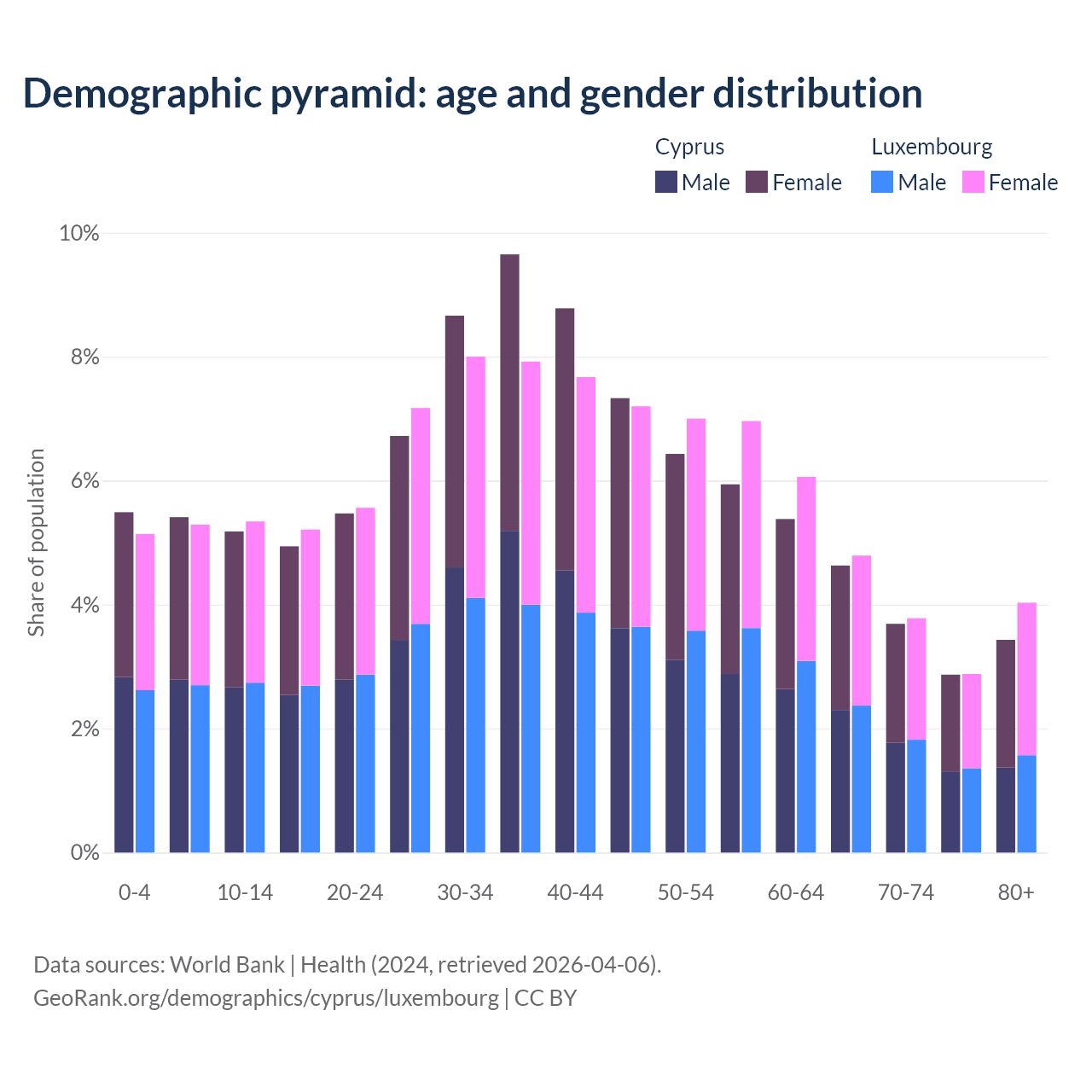 - Cyprus is ranked 52/196 by median age (oldest to youngest) vs 46/196 for Luxembourg.