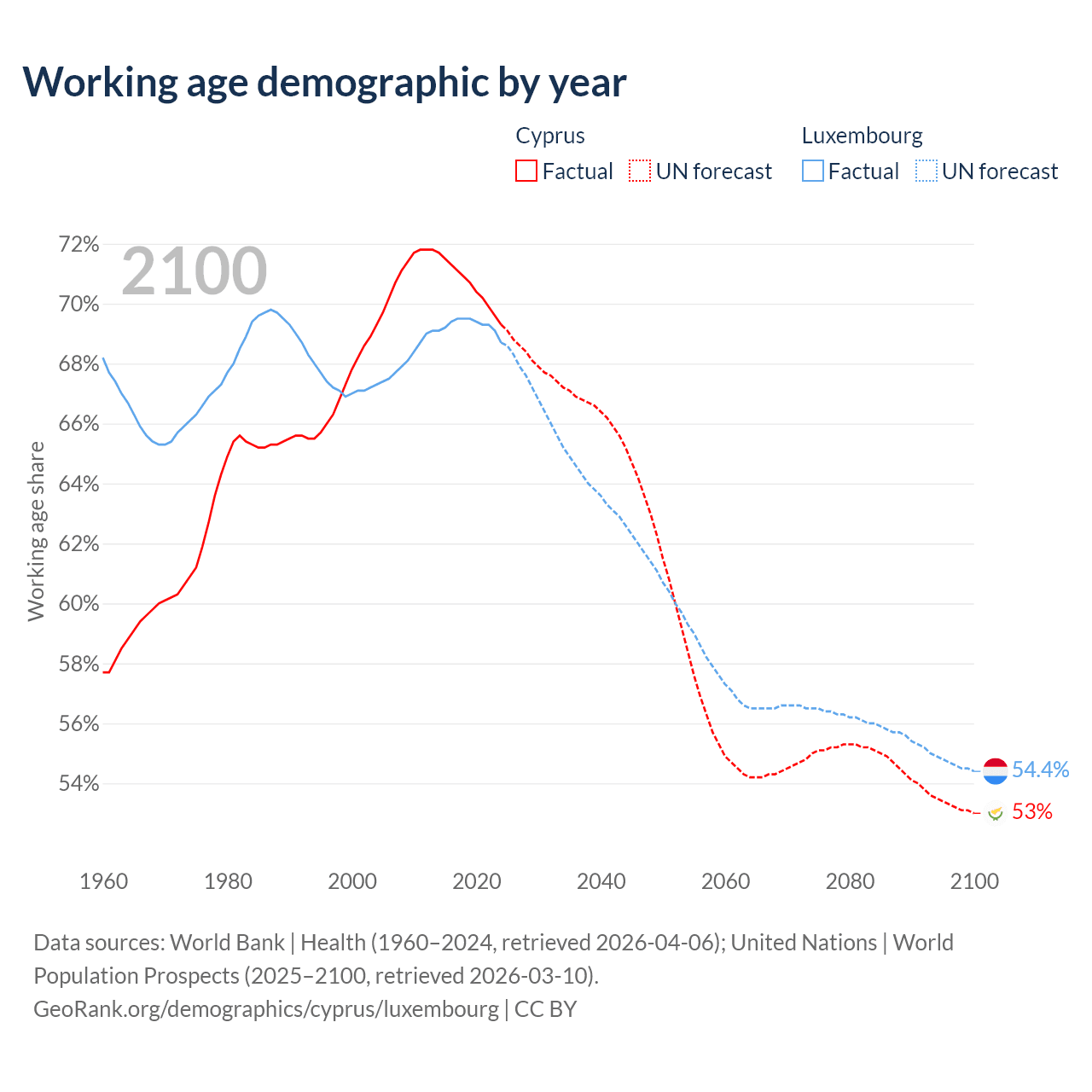 Median age Cyprus vs Luxembourg, 1960-2100