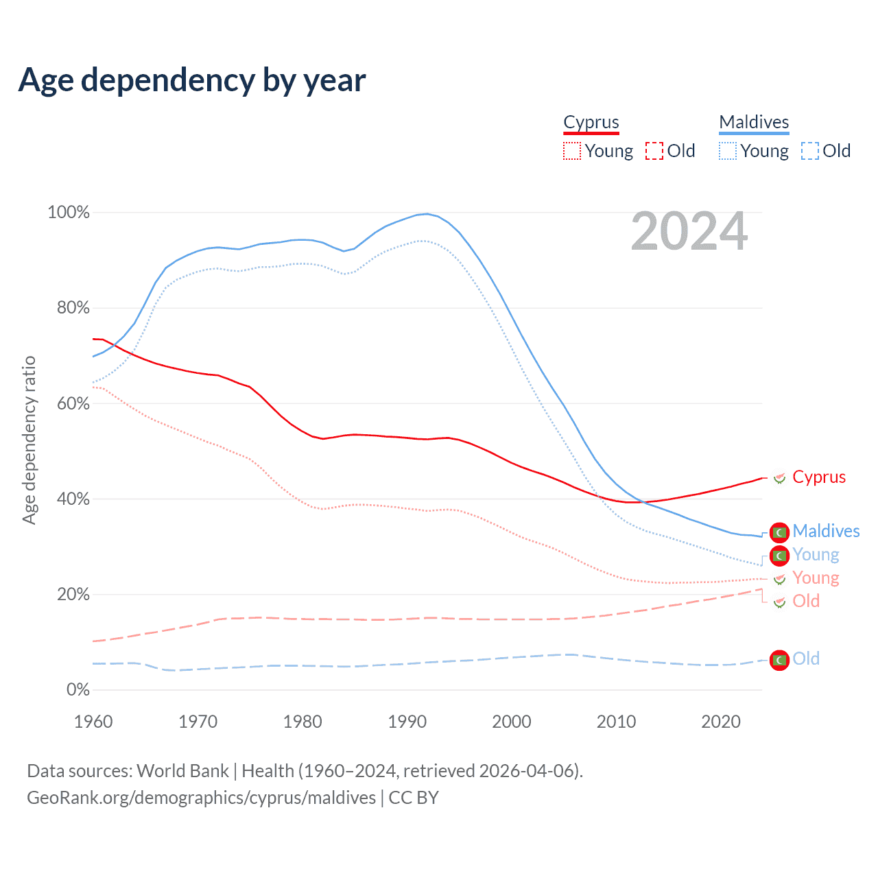 Data sources: World Bank | Health (1960–2024, retrieved 2026-04-06); U.S. Census Bureau (1960–2024, retrieved 2026-02-08).