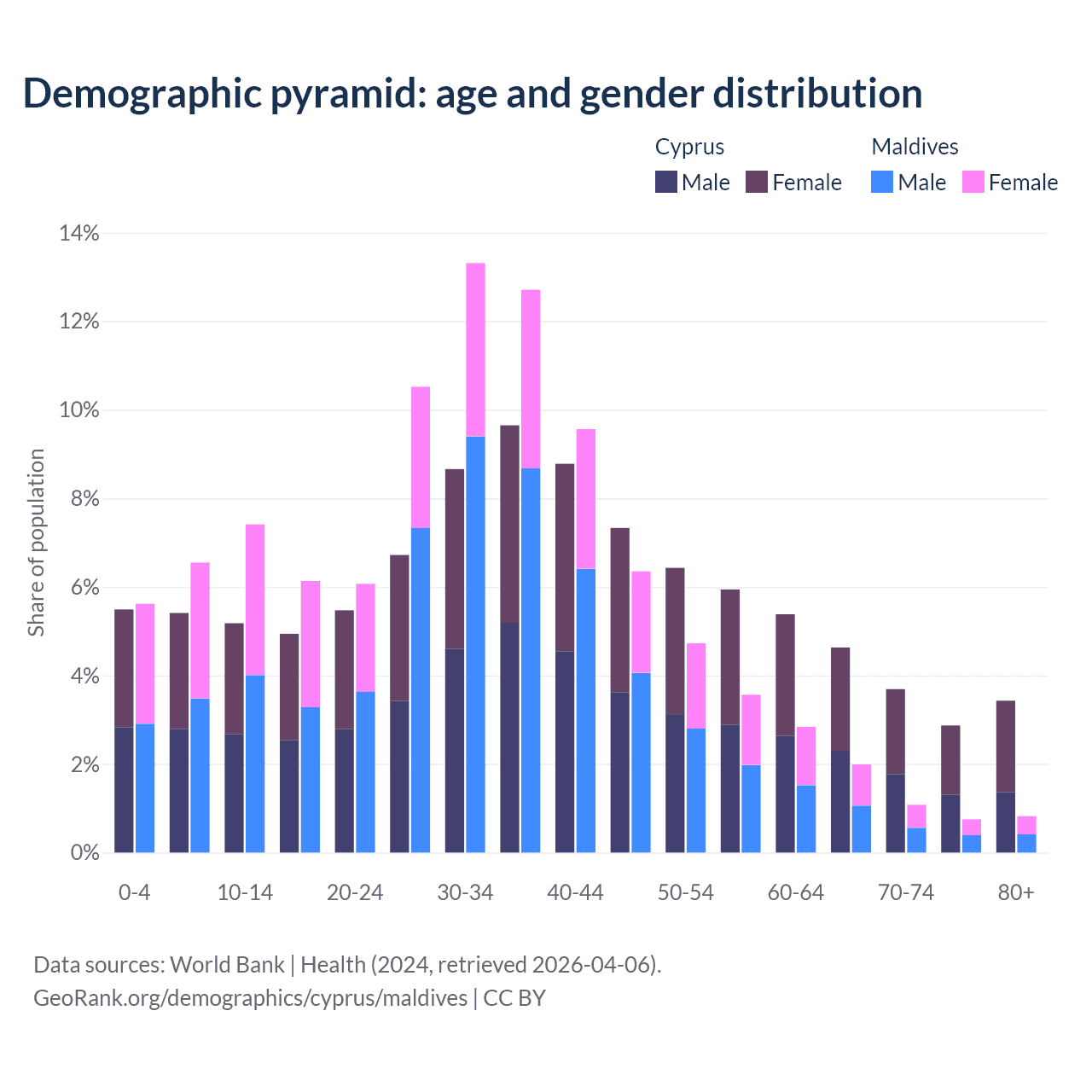 - Cyprus is ranked 52/196 by median age (oldest to youngest) vs 90/196 for Maldives.
