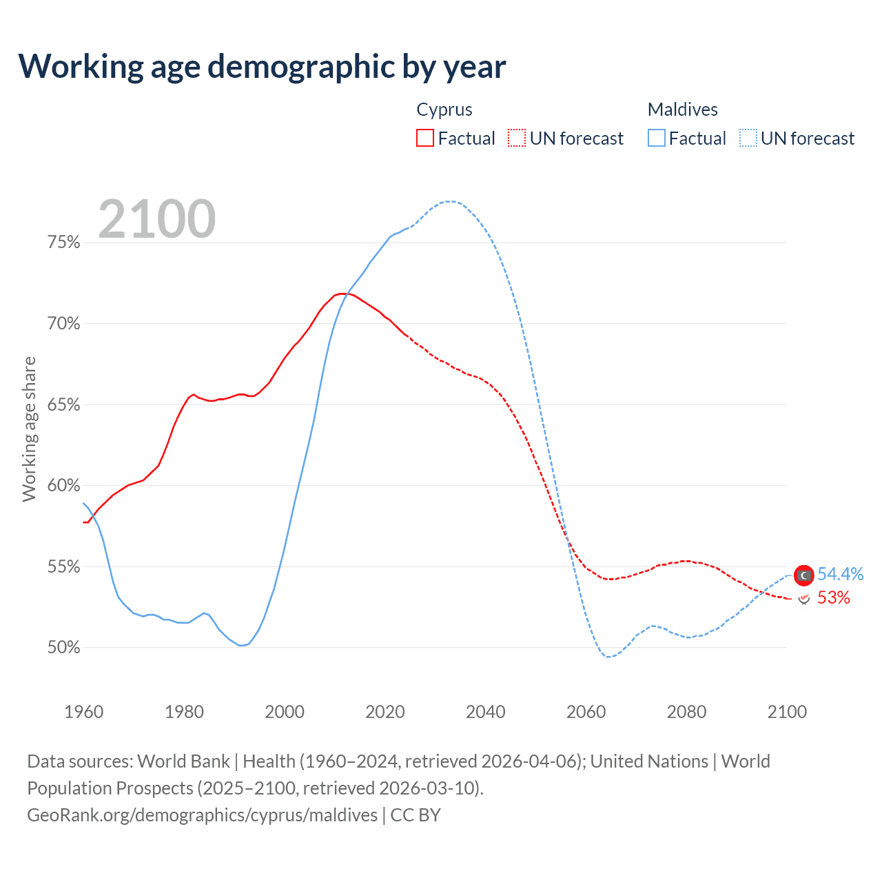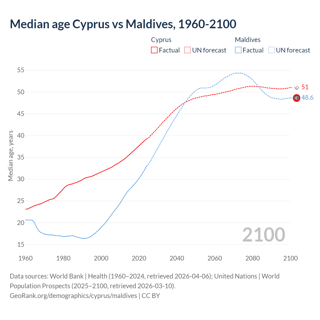 Median age Cyprus vs Maldives, 1960-2100