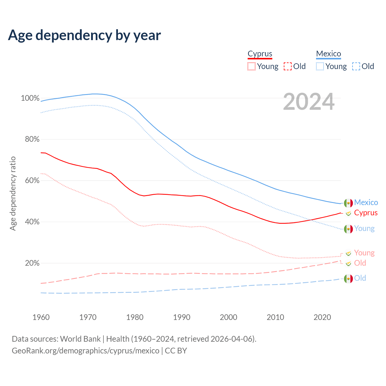 - Cyprus is ranked 52/196 by median age (oldest to youngest) vs 102/196 for Mexico.