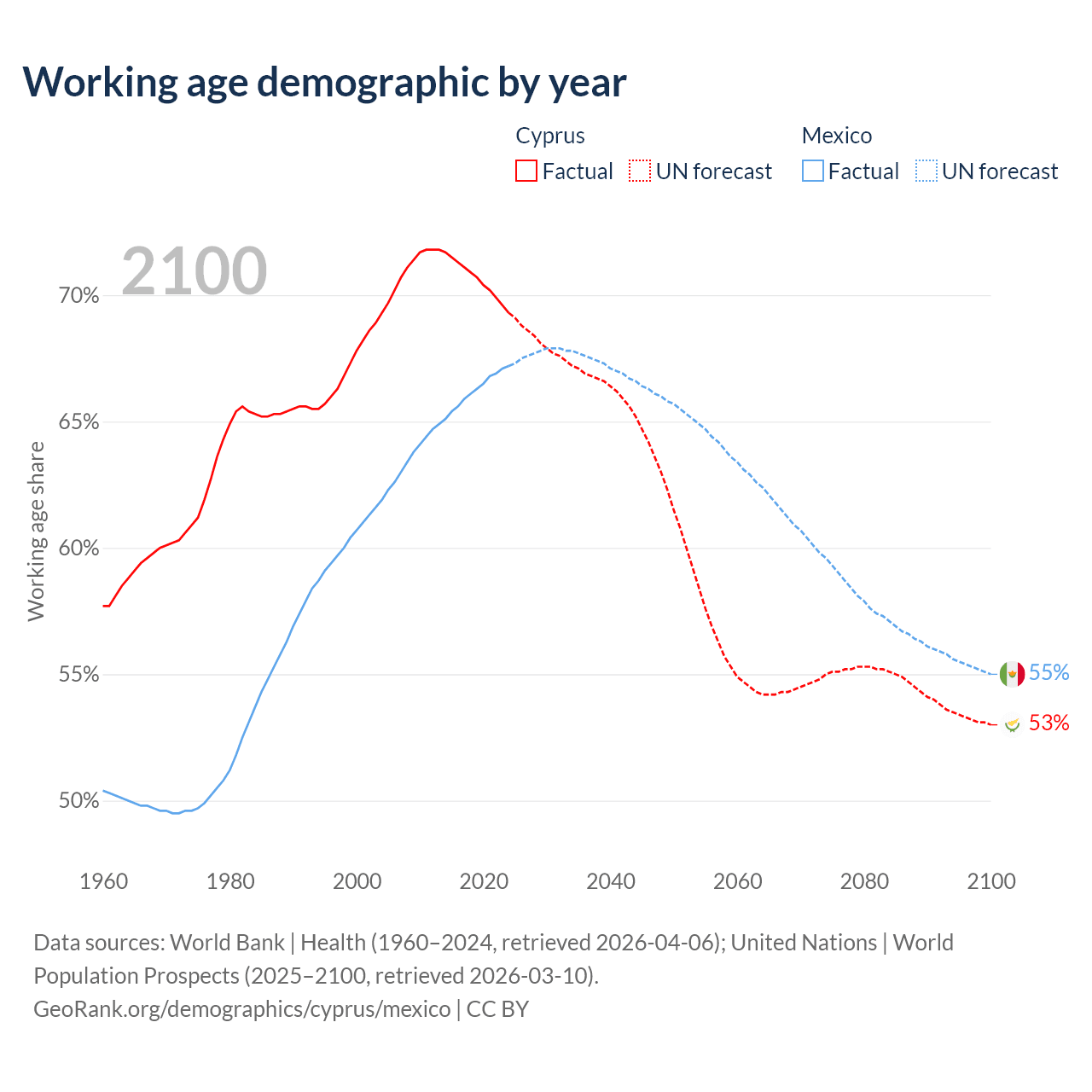 Median age Cyprus vs Mexico, 1960-2100