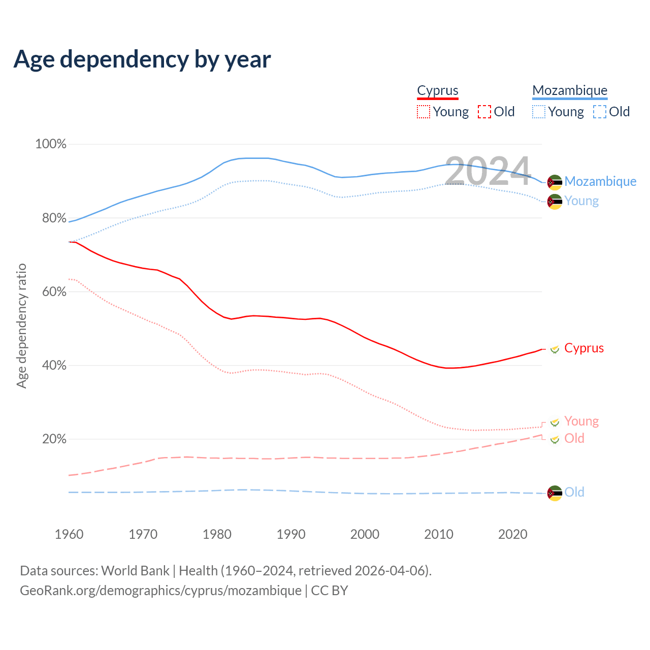 - The share of old-age demographic (65+) in Cyprus is 14.6% vs 2.75% in Mozambique.