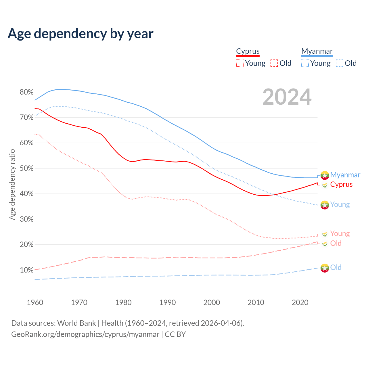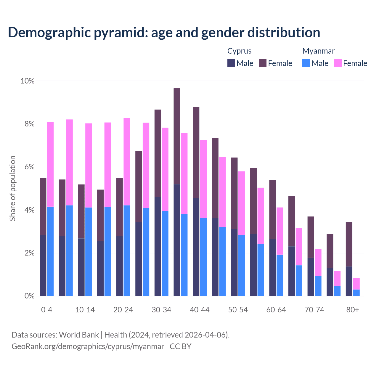 - Cyprus is ranked 52/196 by median age (oldest to youngest) vs 96/196 for Myanmar.