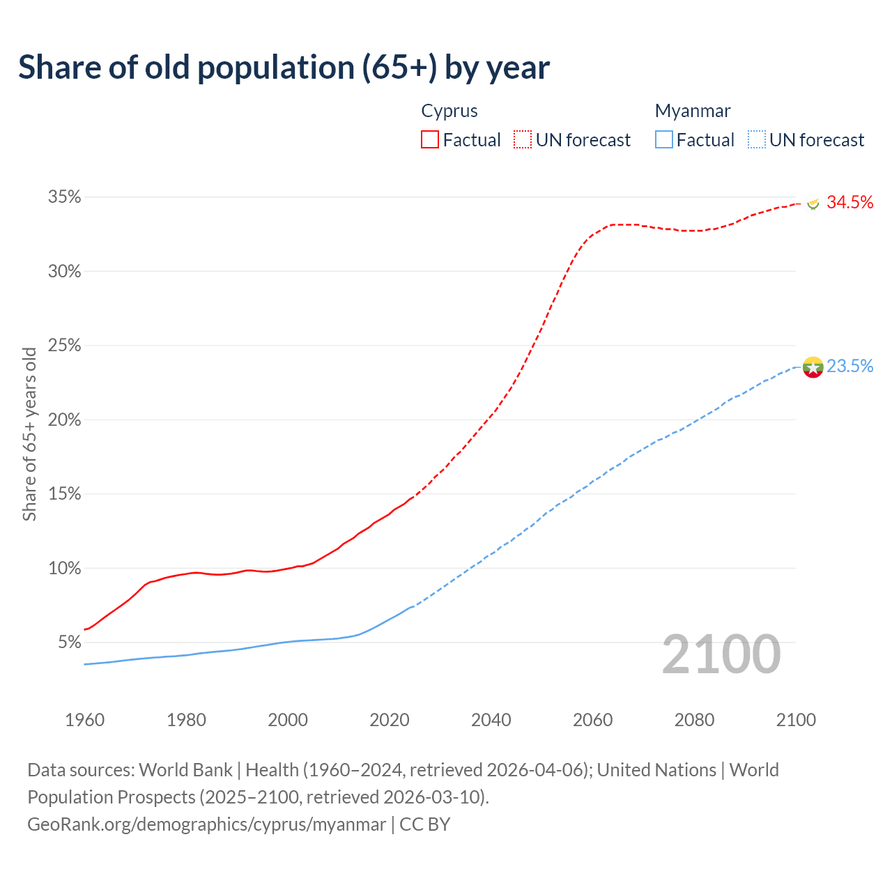 The share of older people aged 65 and over is 14.6% in Cyprus and 7.3% in Myanmar. Life expectancy in Cyprus compared to Myanmar .