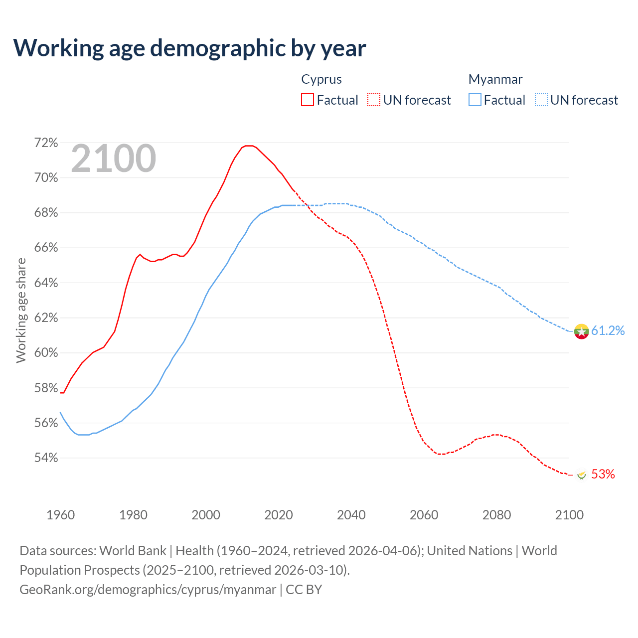 - Cyprus has 961K working age adults (aged 15-64) vs 37.8M in Myanmar.