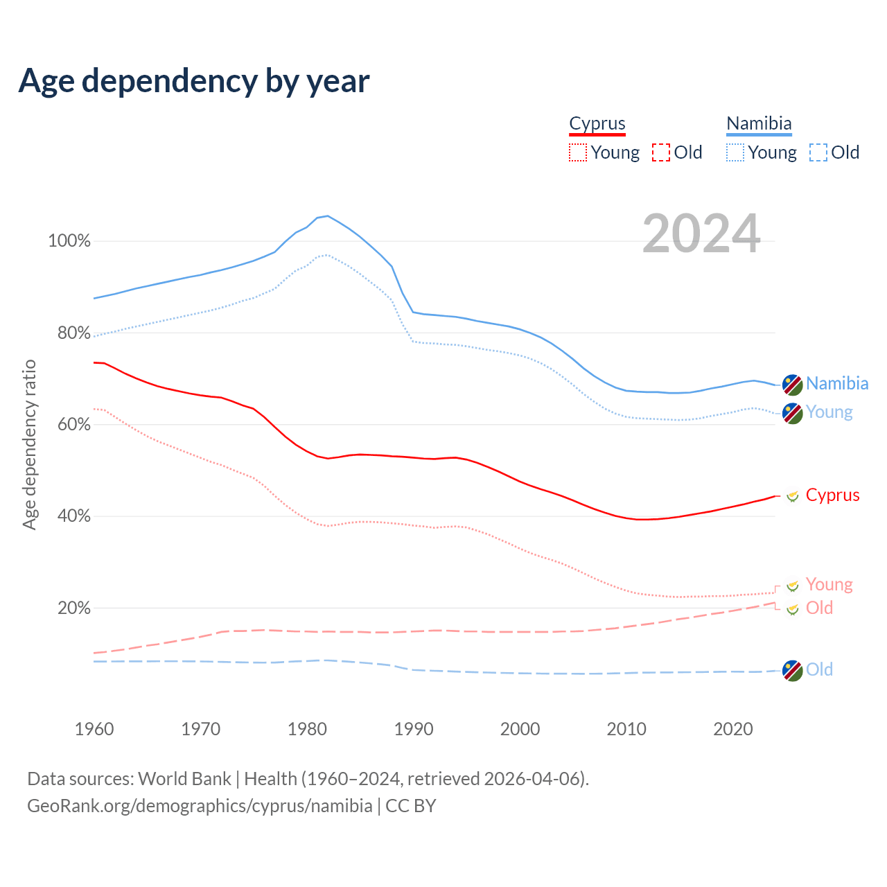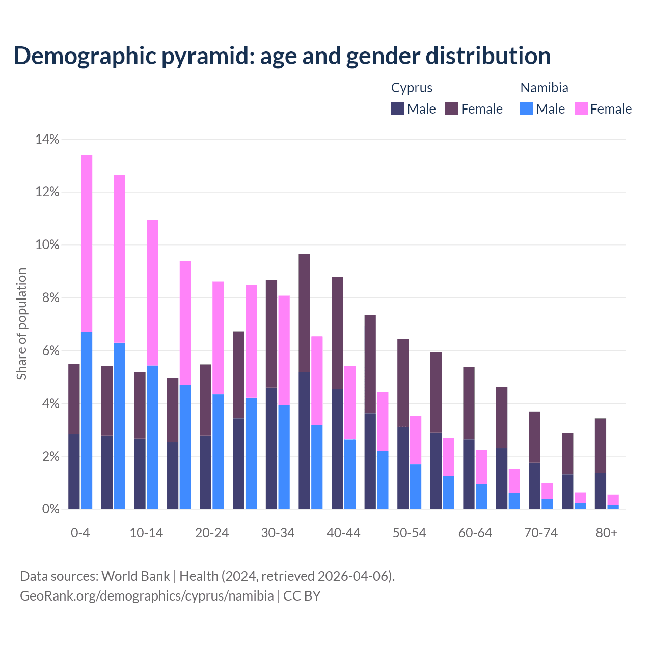 The share of older people aged 65 and over is 14.6% in Cyprus and 3.67% in Namibia. Life expectancy in Cyprus compared to Namibia .