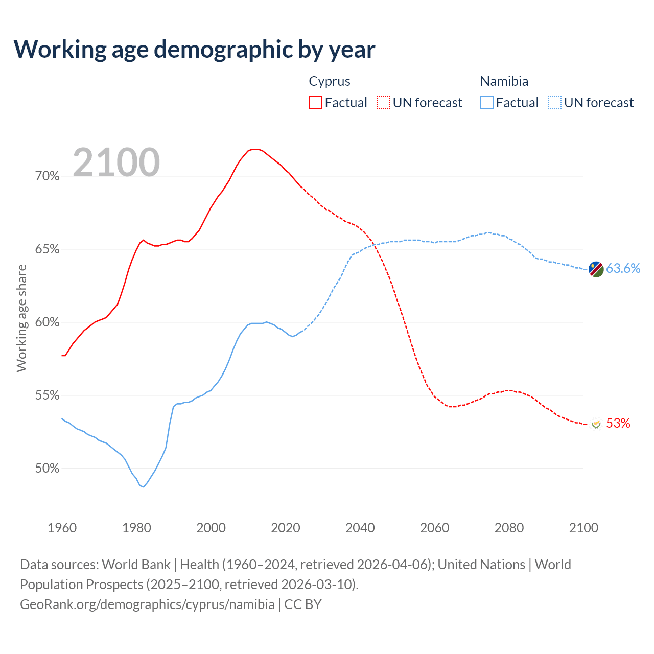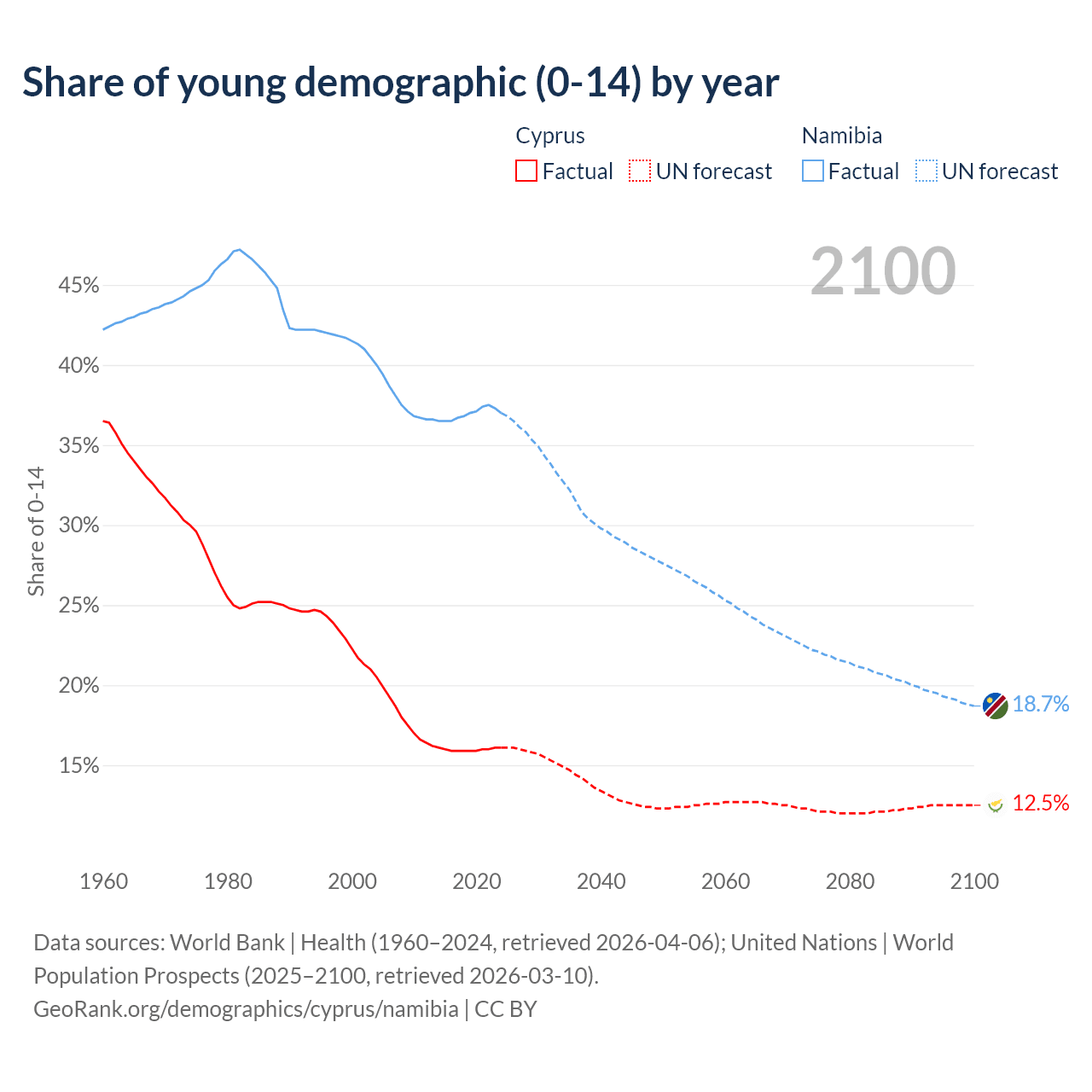 Median age Cyprus vs Namibia, 1960-2100