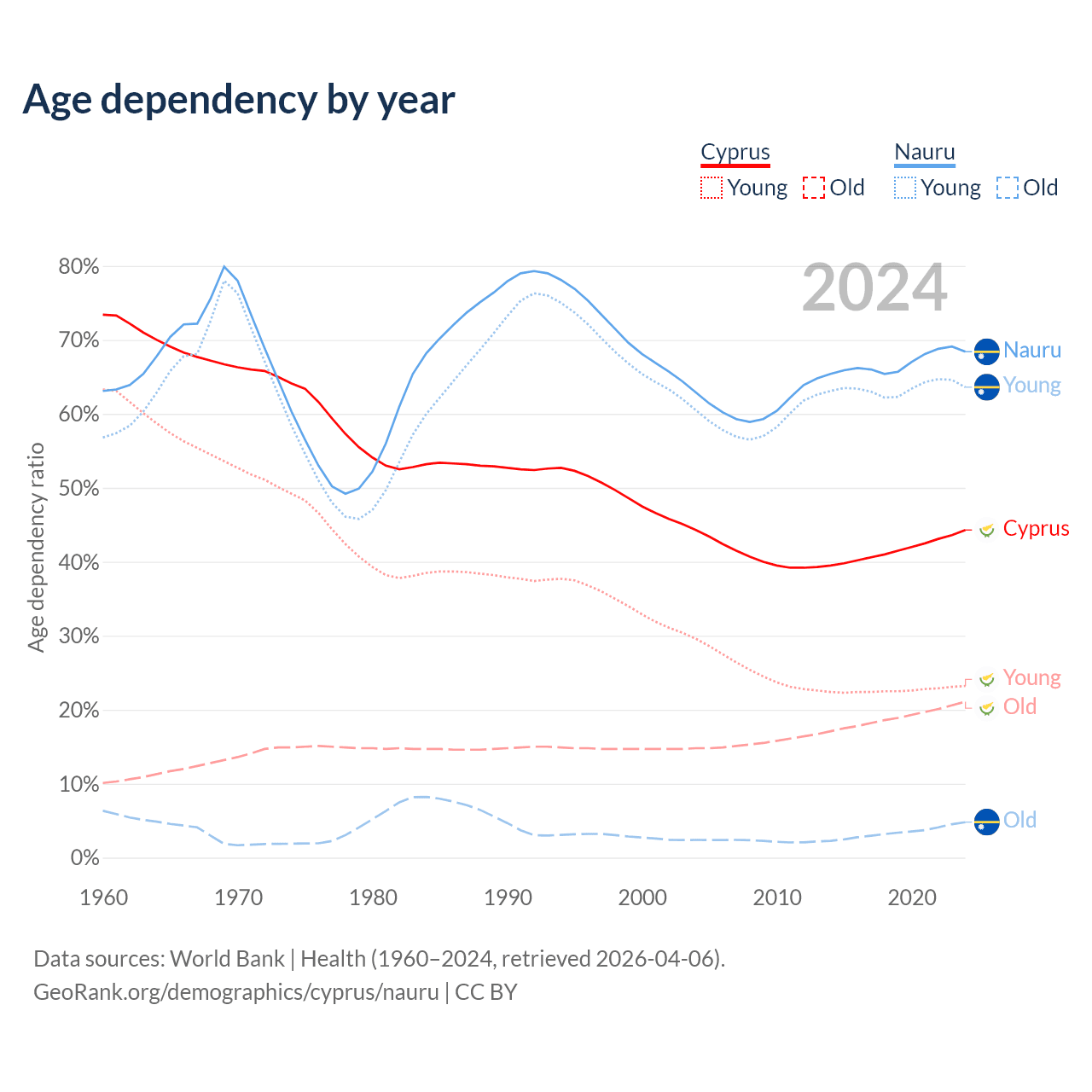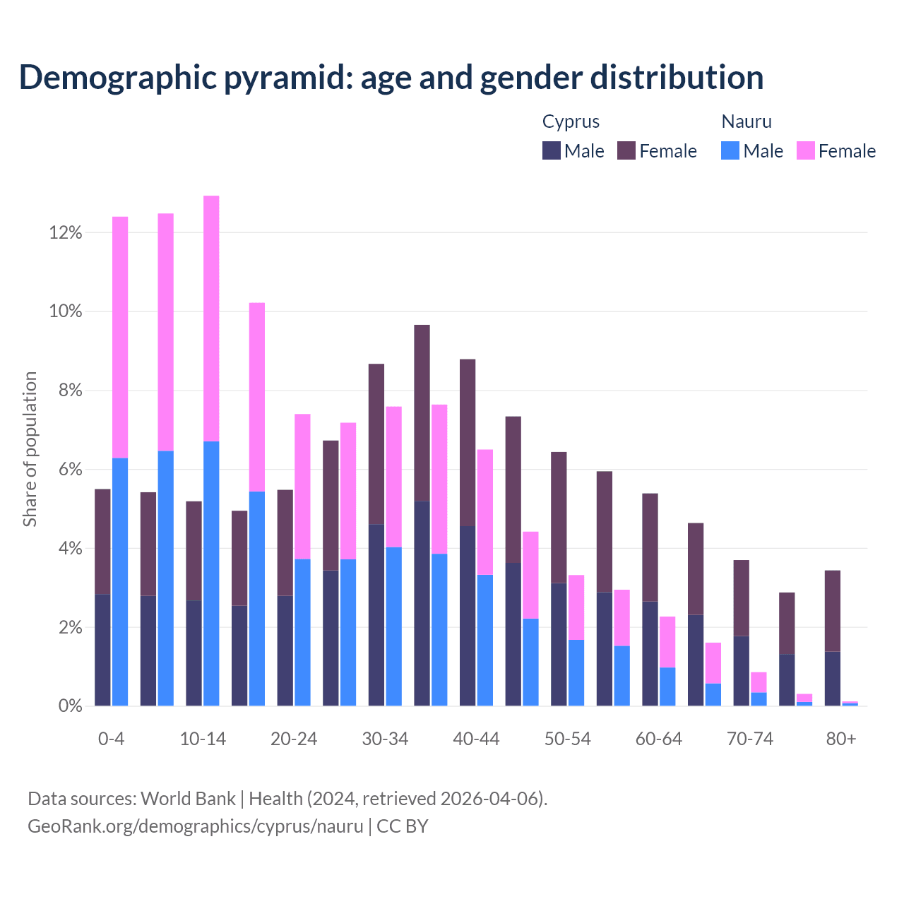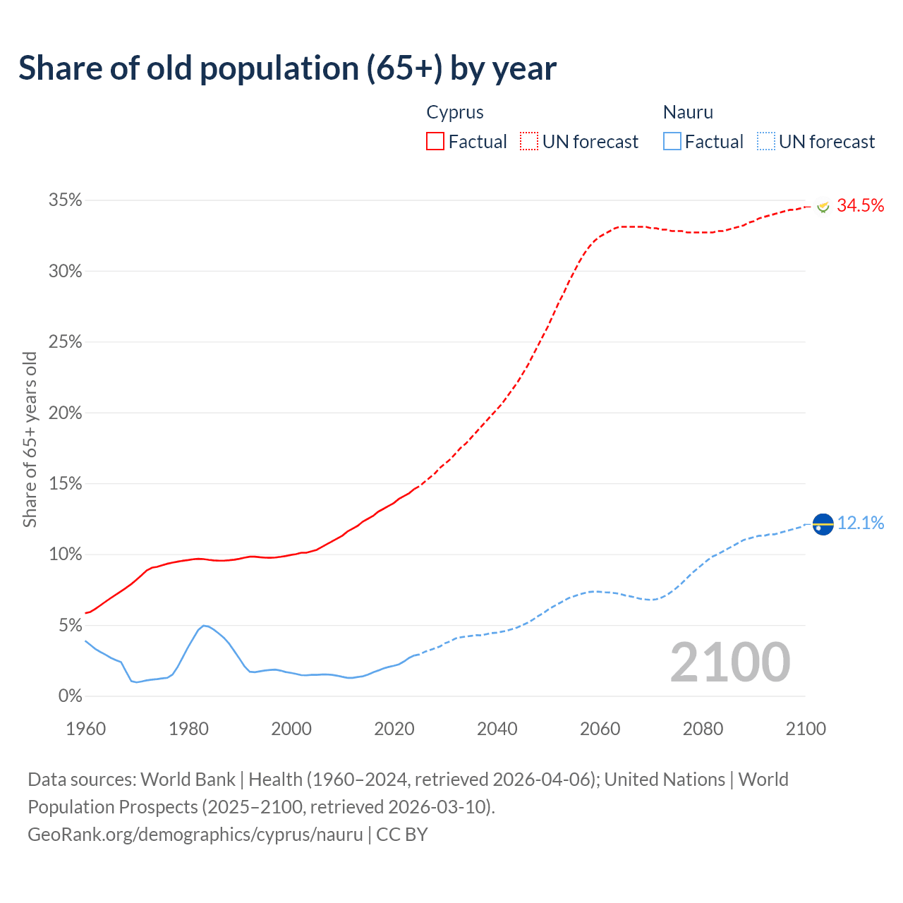 The share of older people aged 65 and over is 14.6% in Cyprus and 2.85% in Nauru. Life expectancy in Cyprus compared to Nauru .