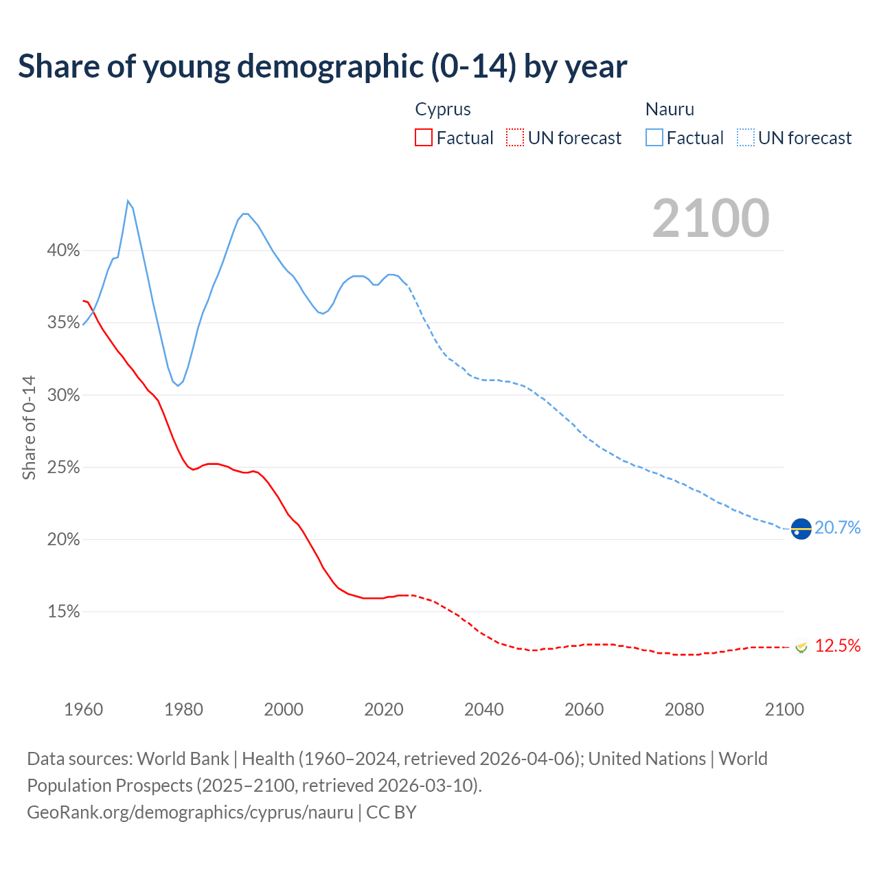 - The share of young demographic (0-15 years old) in Cyprus is 16.1% vs 37.8% in Nauru.