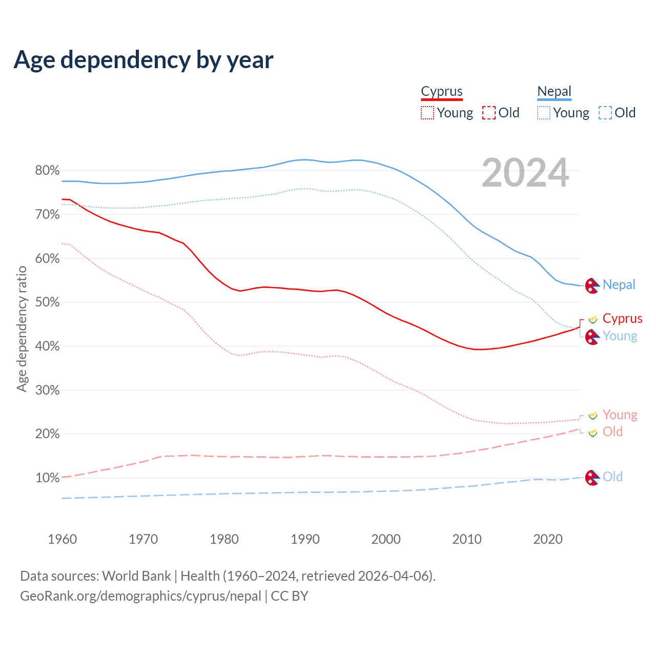 - The share of old-age demographic (65+) in Cyprus is 14.6% vs 6.5% in Nepal.