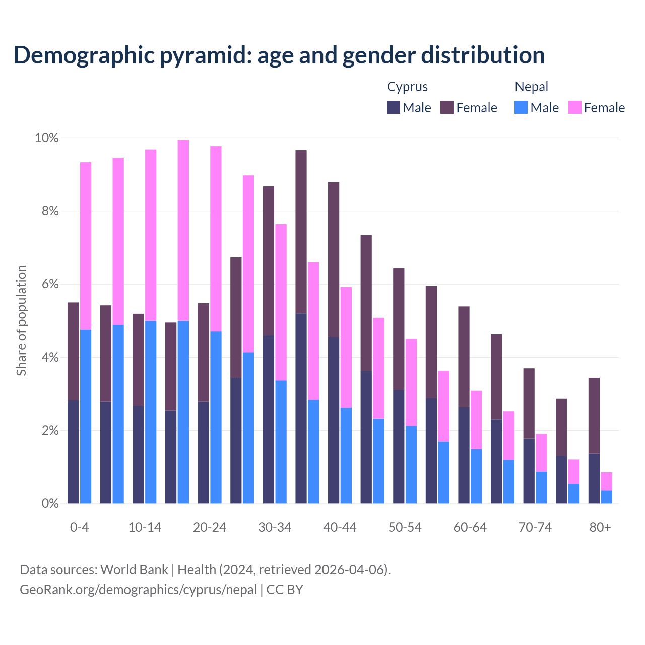- Cyprus is ranked 52/196 by median age (oldest to youngest) vs 127/196 for Nepal.