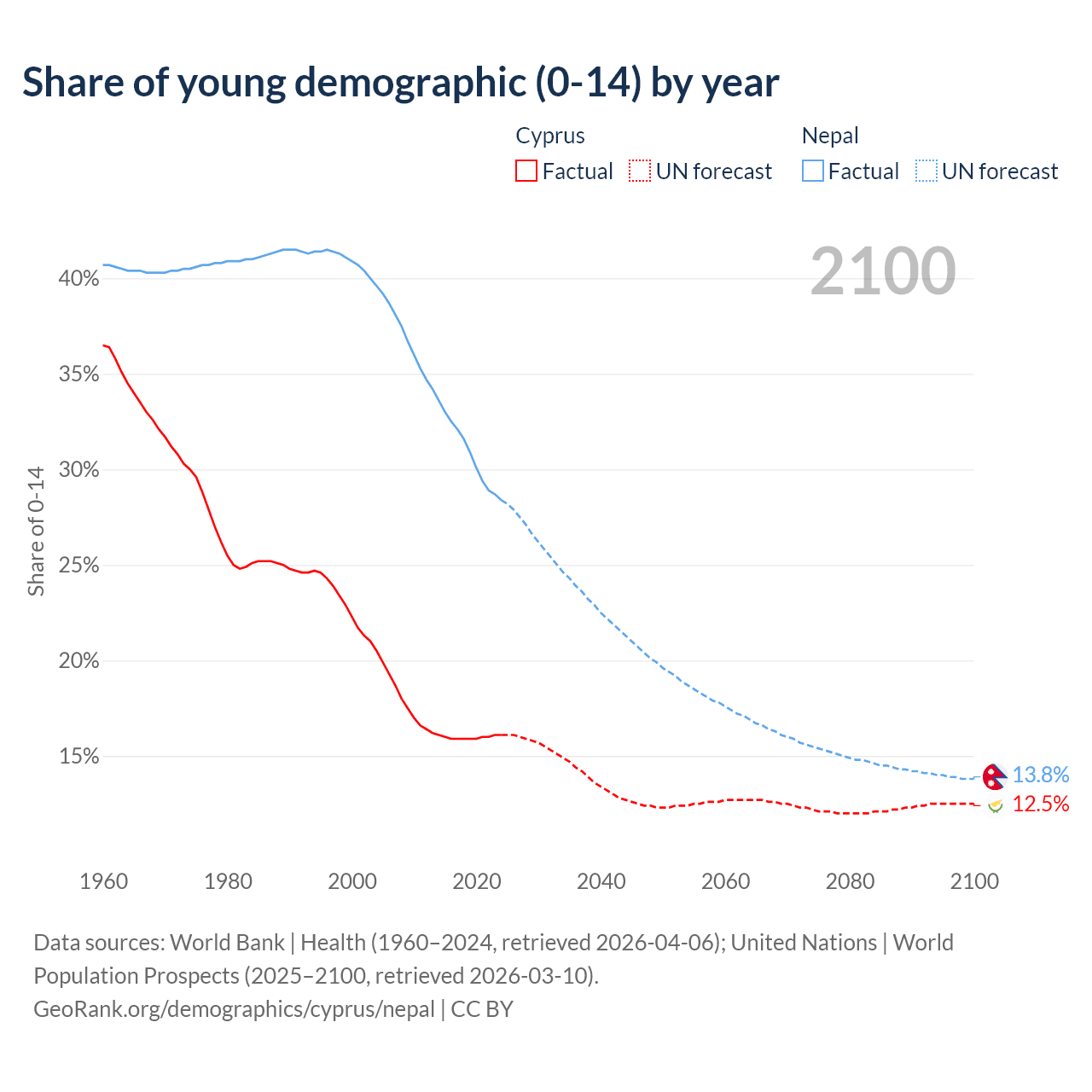 - The share of young demographic (0-15 years old) in Cyprus is 16.1% vs 28.4% in Nepal.