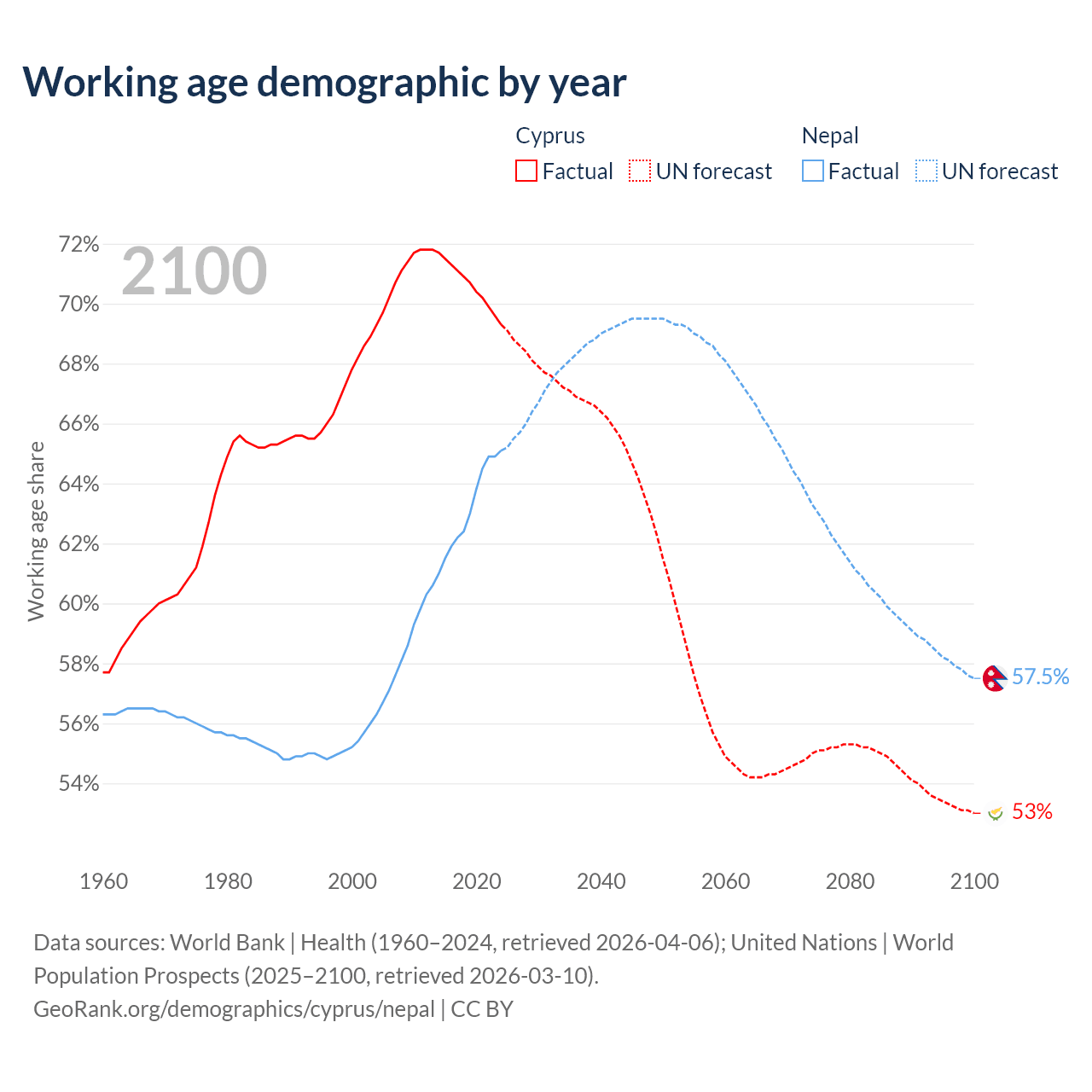 - Cyprus has 961K working age adults (aged 15-64) vs 19.3M in Nepal.