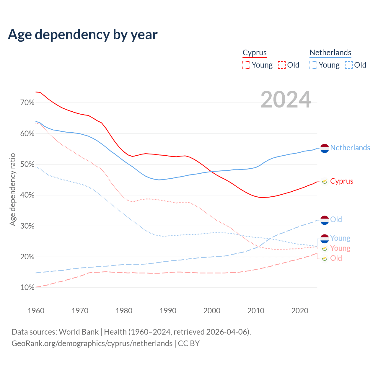 - Cyprus is ranked 52/196 by median age (oldest to youngest) vs 33/196 for the Netherlands.