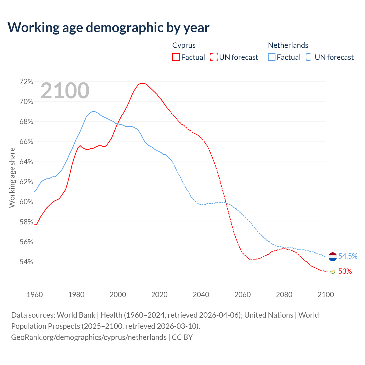 Median age Cyprus vs Netherlands, 1960-2100
