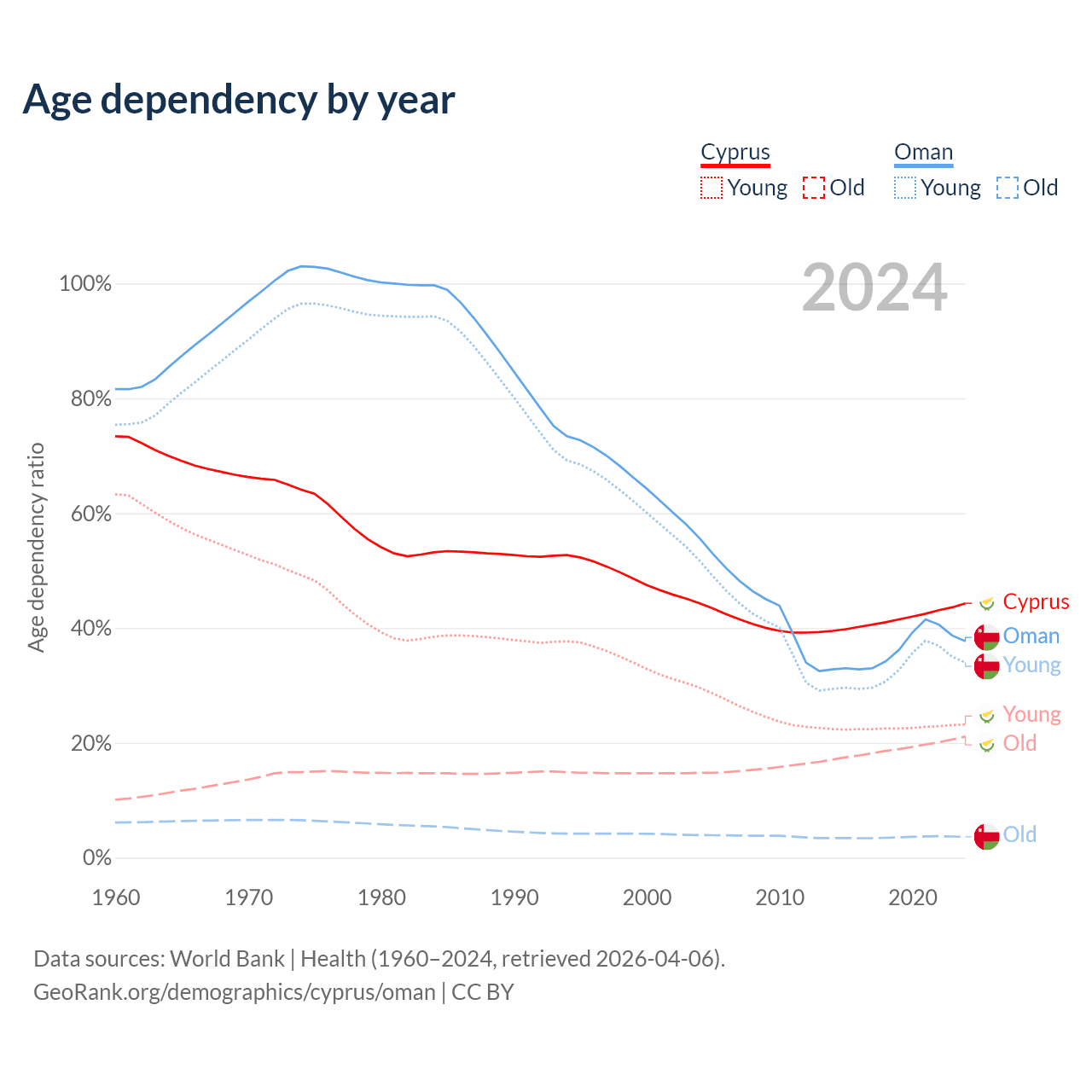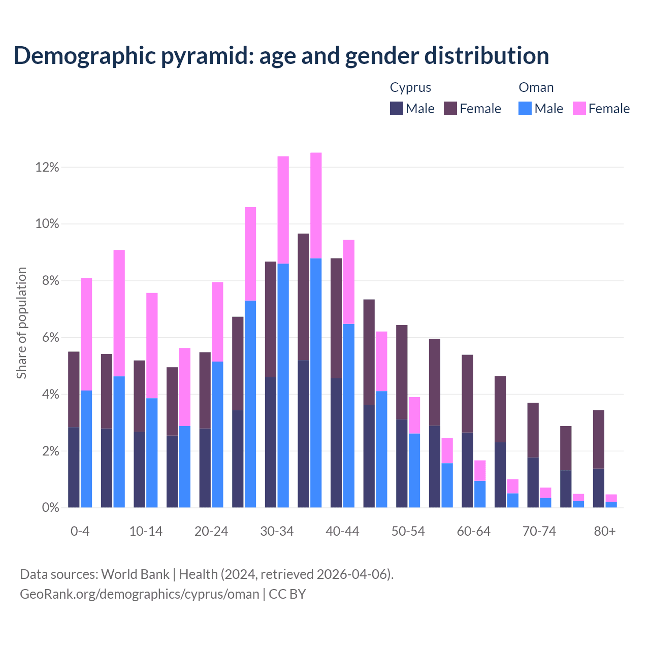 - Cyprus is ranked 52/196 by median age (oldest to youngest) vs 101/196 for Oman.