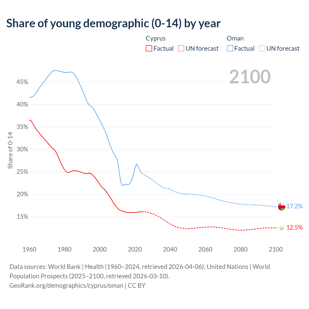 - The share of young demographic (0-15 years old) in Cyprus is 16.1% vs 24.7% in Oman.