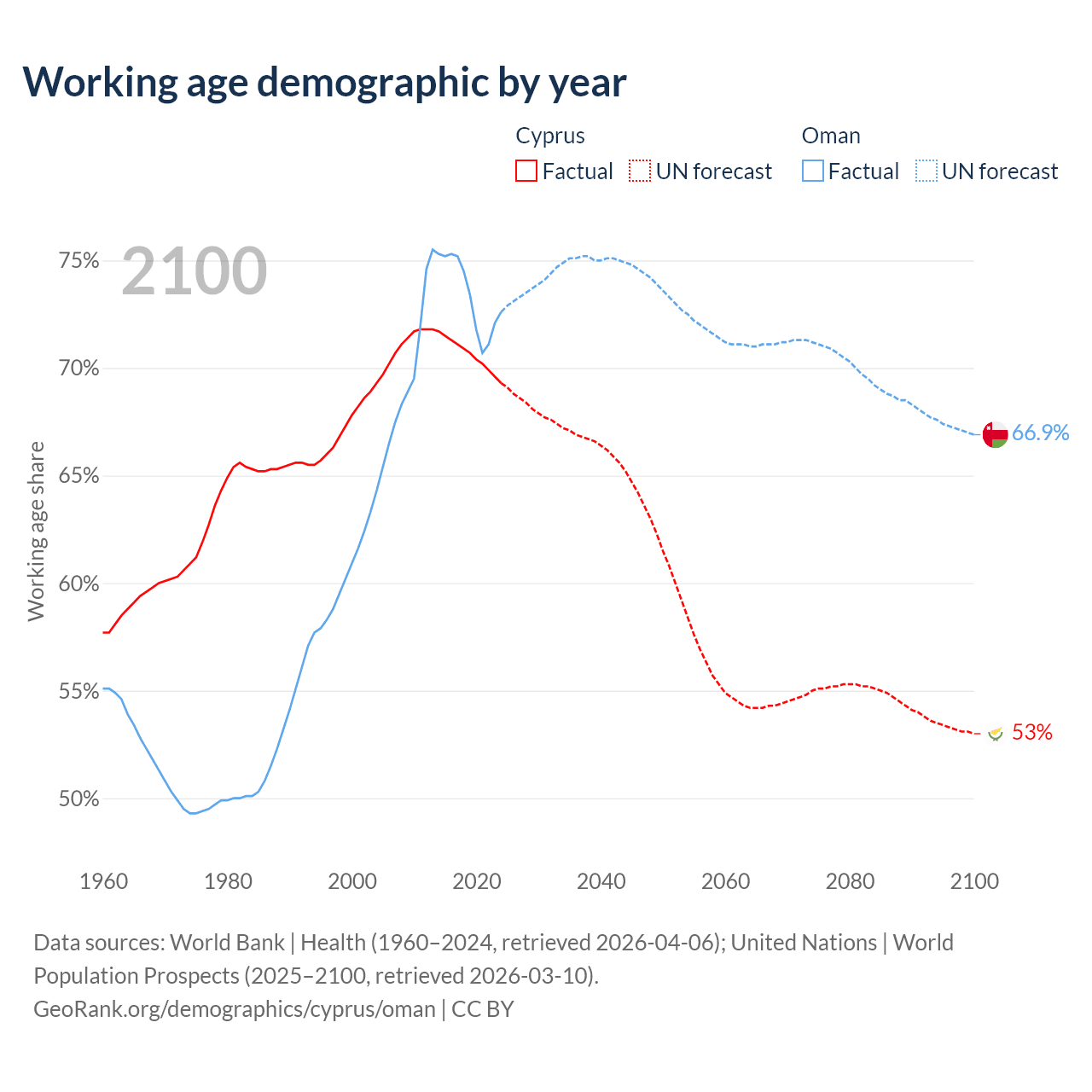 - Cyprus has 961K working age adults (aged 15-64) vs 4.19M in Oman.