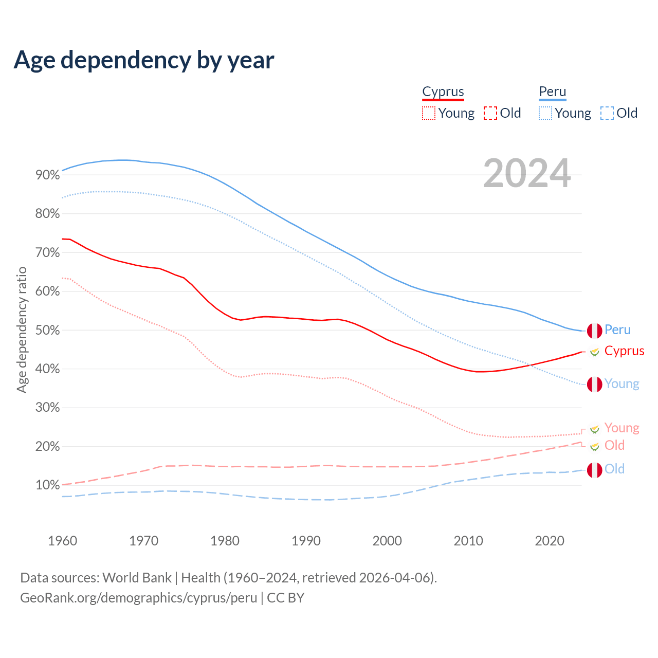 The share of older people aged 65 and over is 14.6% in Cyprus and 9.23% in Peru. Life expectancy in Cyprus compared to Peru .
