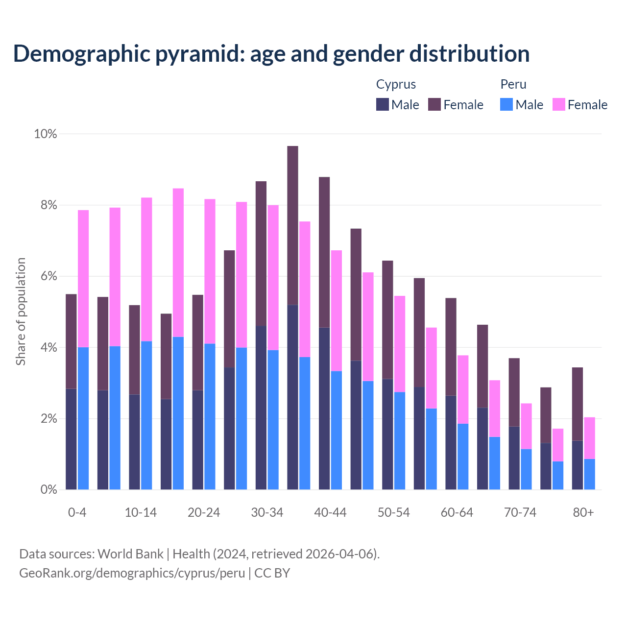 - Cyprus is ranked 52/196 by median age (oldest to youngest) vs 97/196 for Peru.