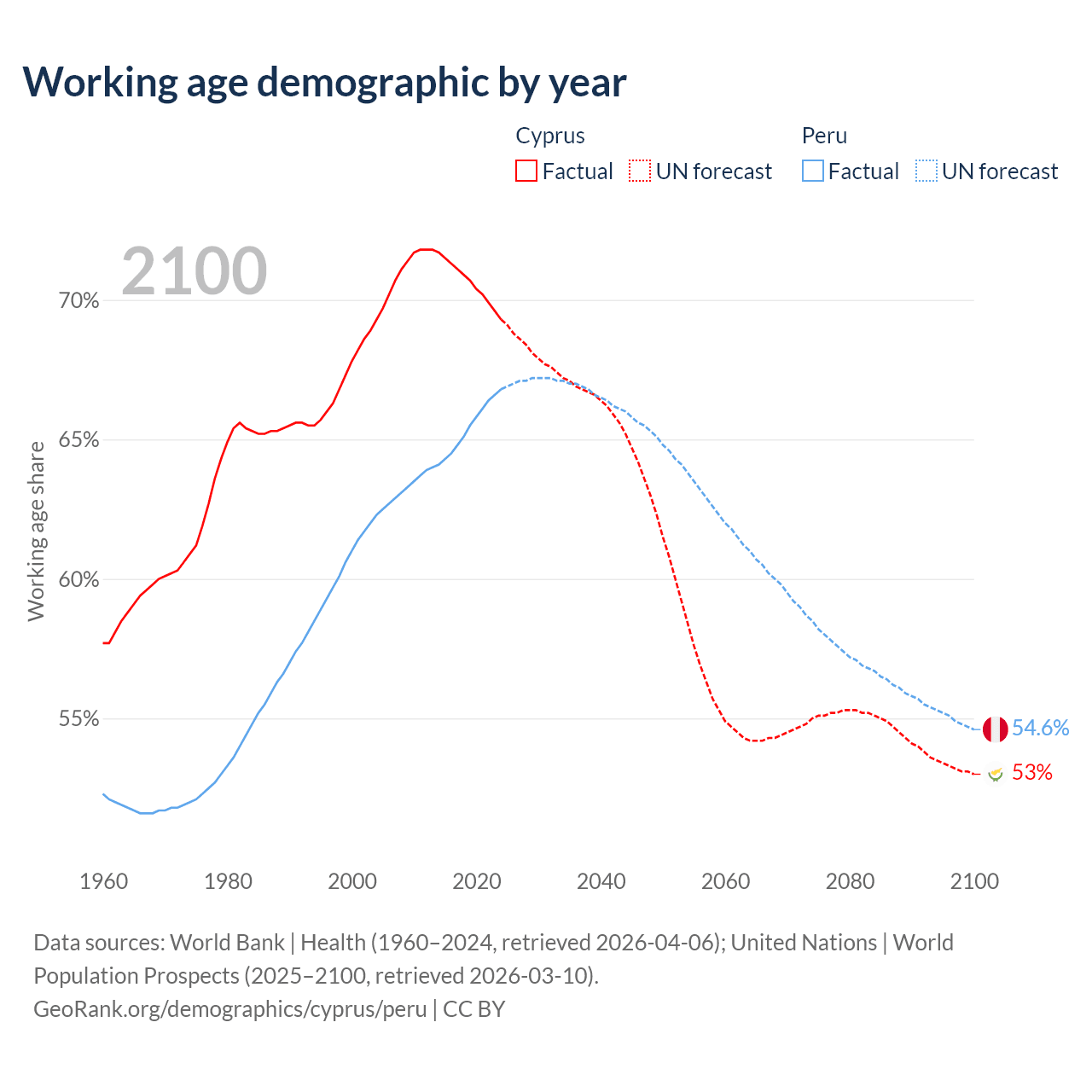 Median age Cyprus vs Peru, 1960-2100